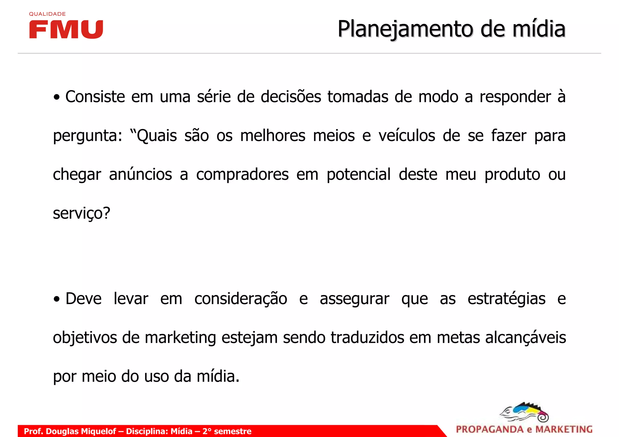 O documento discute os principais conceitos de planejamento de mídia, incluindo a seleção de veículos de mídia considerando público-alvo, cronograma e objetivos. Também aborda conceitos-chave como alcance, frequência e classes de mídia para definir um plano de mídia eficaz.