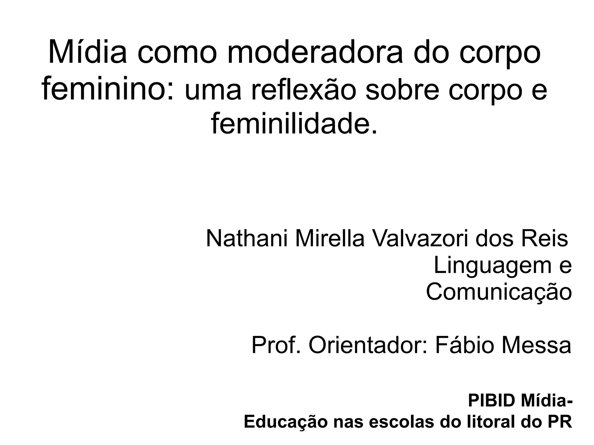 Este documento discute como a mídia modera o corpo feminino através da representação e construção da feminilidade. Ele explora como o corpo feminino é fragmentado e idealizado pela mídia para atender aos padrões sociais, e como a feminilidade é afirmada através de signos instituídos para criar desejo. Também analisa como a necessidade de "pasteurização" das mulheres na mídia reforça os papéis de gênero definidos culturalmente.