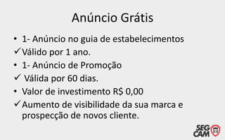 O documento detalha três tipos de anúncios com diferentes pacotes de investimento, que visam aumentar a visibilidade da marca e atrair novos clientes. Os anúncios incluem promoções, distribuição de cartões e banners publicitários, variando em duração e custo. O investimento é apresentado de forma acessível, comparando-o a pequenos custos diários, destacando os benefícios de marketing.