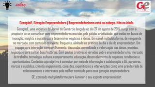O GeraçãoE é uma iniciativa do Jornal do Comércio para se comunicar com empreendedores por meio de conteúdo multiplataforma sobre empreendedorismo. O projeto visa conectar estudantes, líderes e empresários oferecendo informações sobre novos negócios, inovação e tendências. As empresas podem patrocinar o GeraçãoE por meio de anúncios online e offline para engajar essa geração empreendedora.