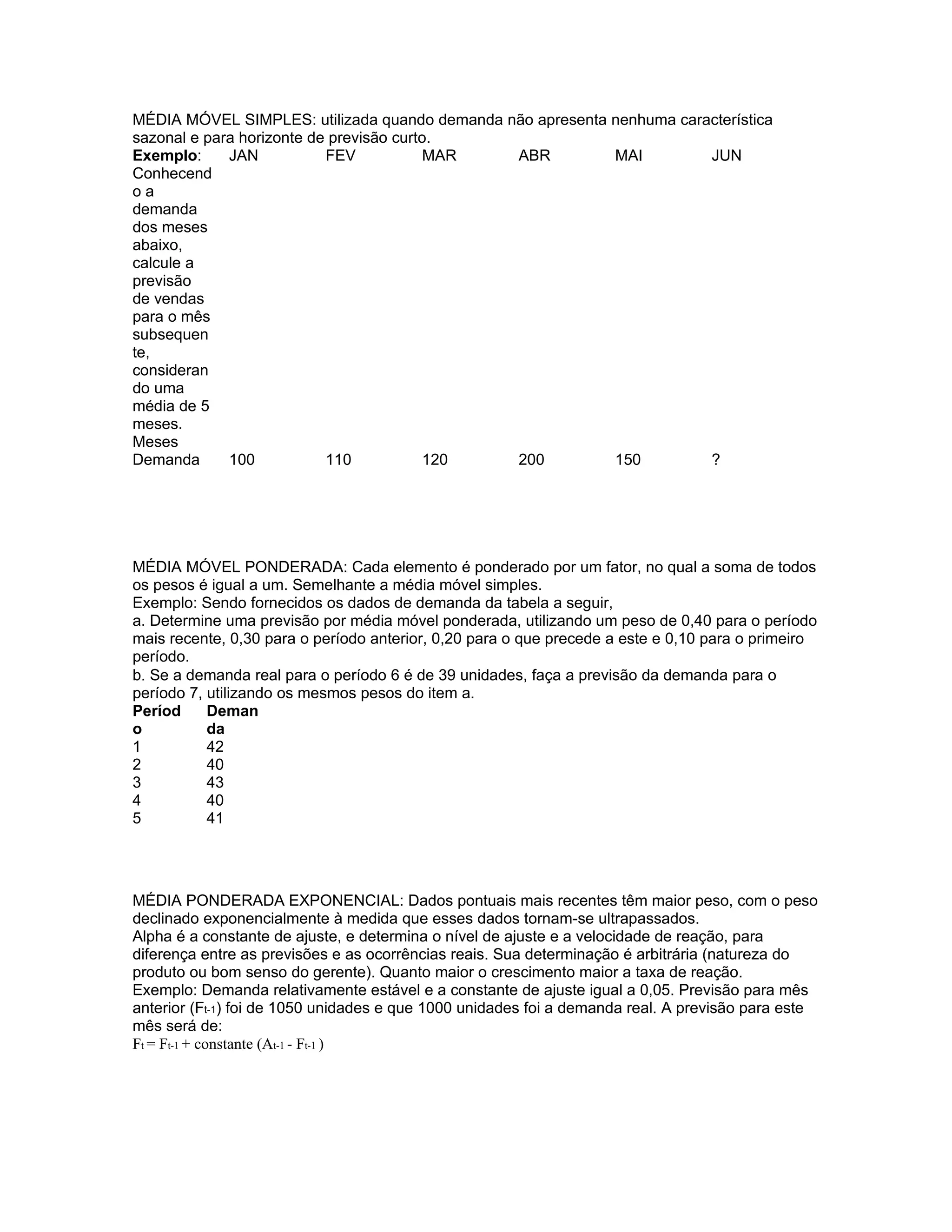O documento descreve diferentes métodos de previsão de demanda, incluindo média móvel simples, média móvel ponderada e média ponderada exponencial. Ele também discute como medir e controlar erros de previsão e define diferentes horizontes de previsão, incluindo curto, médio e longo prazo. Além disso, o documento explica o cálculo e uso de índices sazonais para previsão.
