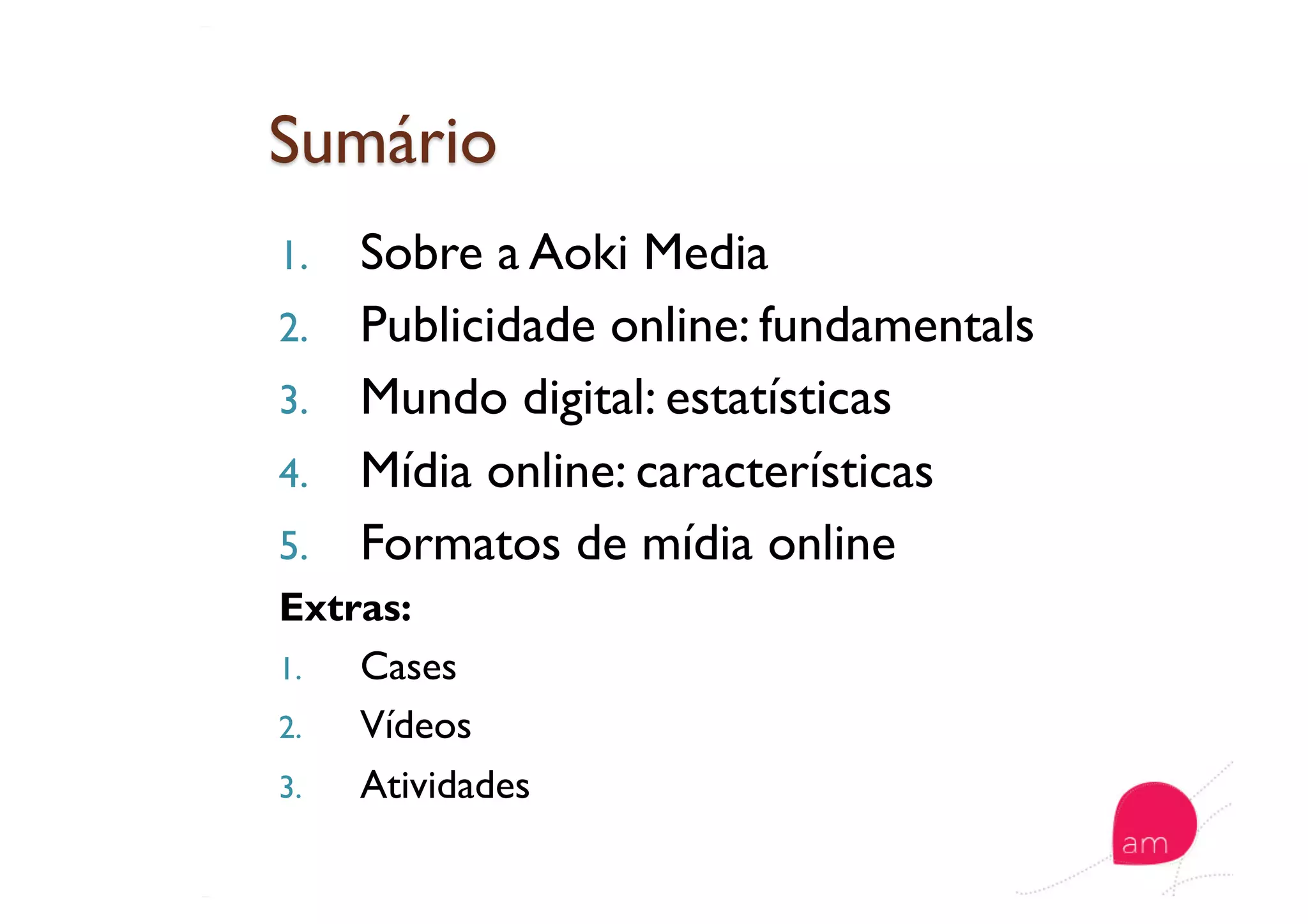 O documento fornece uma visão abrangente sobre a Aoki Media, destacando sua atuação na publicidade online e as características do mundo digital, com dados e estatísticas sobre o uso de mídias sociais no Brasil. Aborda também a evolução da publicidade digital, incluindo formatos, segmentação e a importância da análise de mercado e do consumidor. Além disso, menciona as plataformas e estratégias utilizadas para anúncios, ressaltando a necessidade de adaptação às novas realidades e comportamentos dos consumidores.