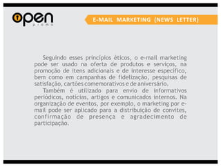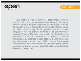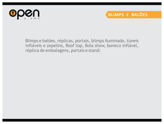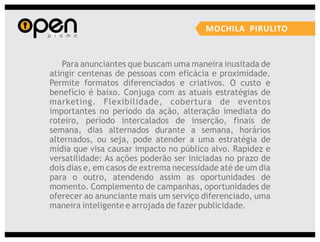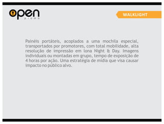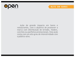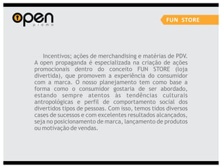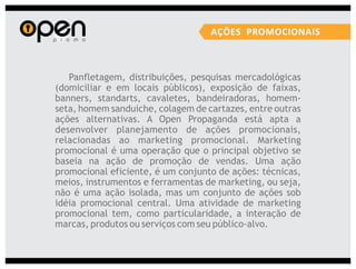 A Open Propaganda oferece uma variedade de serviços de marketing, incluindo marketing promocional, eventos, merchandising, mídias alternativas e design. Eles executam campanhas usando técnicas como distribuição de brindes, blitzes de divulgação, shows móveis e design de materiais promocionais.