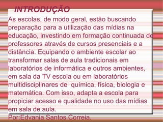 O documento discute a aplicação das mídias na educação e argumenta que (1) as escolas estão investindo em formação de professores e equipamento para uso das mídias em sala de aula, (2) as tecnologias podem auxiliar os professores a ensinar de maneira dinâmica e complementar o conteúdo, e (3) é necessária capacitação de todos para o uso apropriado das mídias no processo de ensino-aprendizagem.