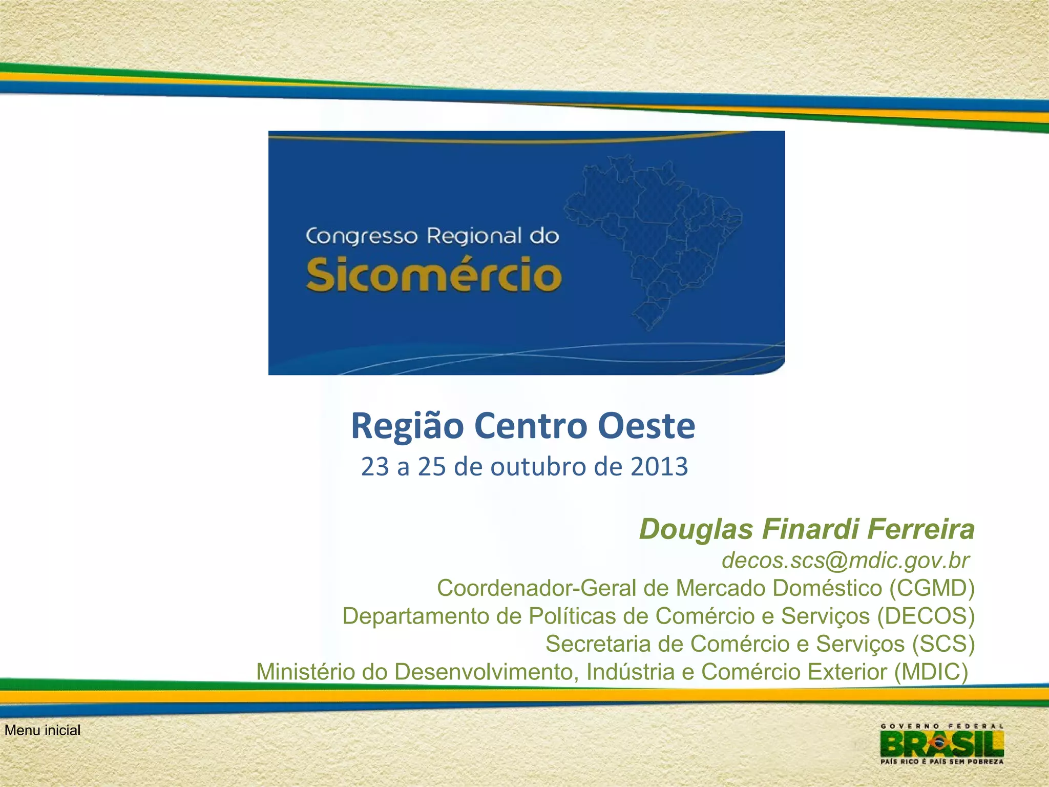 Este documento descreve a agenda de uma conferência sobre comércio e serviços realizada nos dias 23 a 25 de outubro de 2013 na Região Centro-Oeste do Brasil. A agenda inclui apresentações sobre o Plano Brasil Maior, conselhos de competitividade, e a agenda estratégica para comércio, serviços e logística.