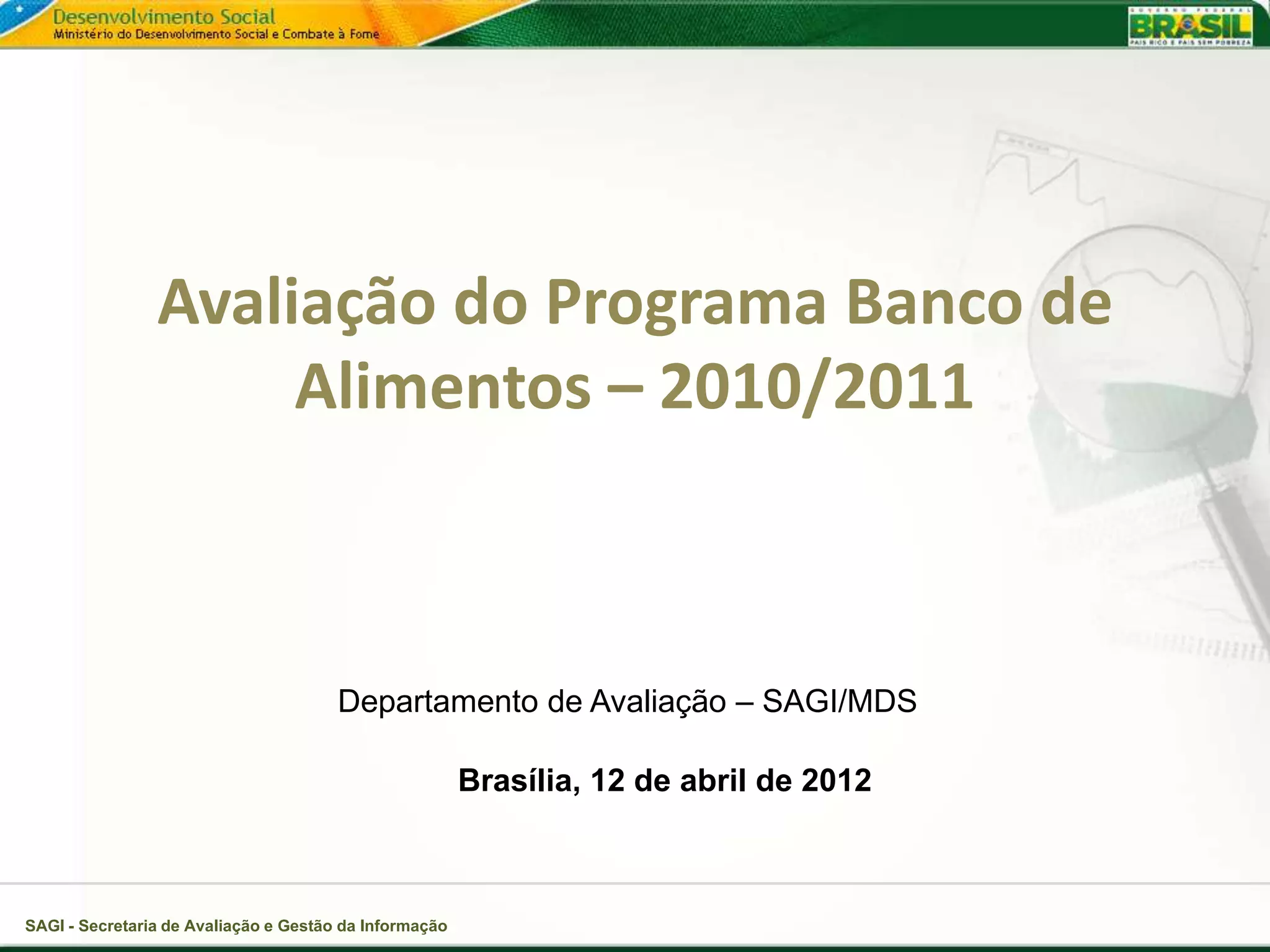 Este documento resume uma avaliação do Programa Banco de Alimentos realizada entre 2010-2011. A pesquisa avaliou 53 bancos de alimentos e 1768 instituições beneficiárias. Os principais achados foram: 1) grande diversidade na organização dos bancos; 2) dependência dos bancos das doações do PAA; 3) necessidade de melhorias na infraestrutura e gestão dos bancos. Recomendações incluem estimular captação de alimentos, articular com outros programas, e apoiar bancos segundo seu porte.