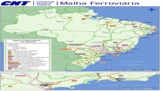 O documento discute os modais de transporte rodoviário e ferroviário, comparando suas características, vantagens e desvantagens. O transporte rodoviário é adequado para curtas e médias distâncias enquanto o ferroviário é mais indicado para longas distâncias devido a seu menor custo. Ambos modais enfrentam desafios como falta de investimento em infraestrutura e manutenção no Brasil.
