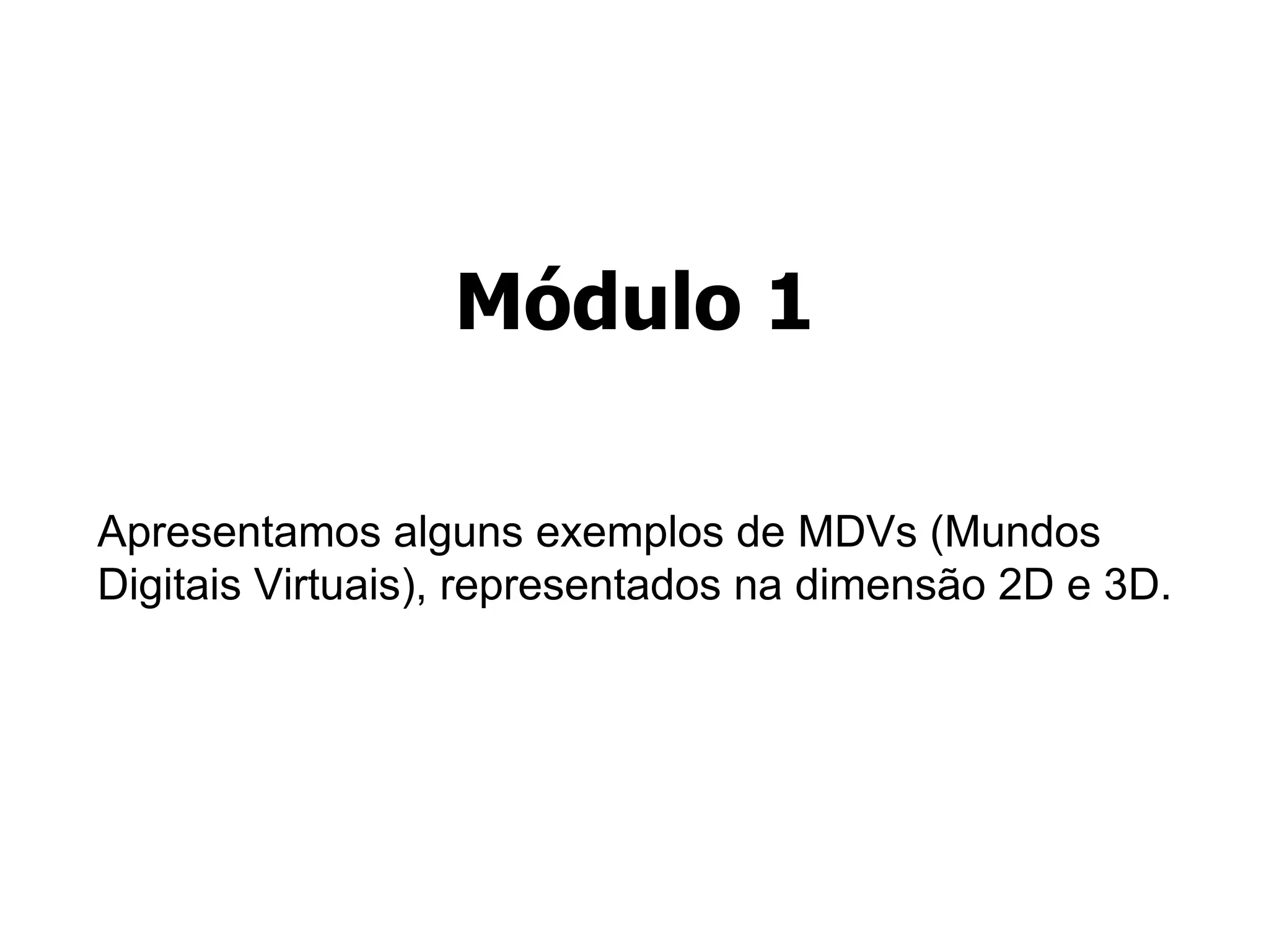 O documento apresenta exemplos de Mundos Digitais Virtuais (MDVs) em 2D e 3D, descrevendo o The Palace como um dos softwares de conversação 2D mais populares da Internet onde usuários podem encontrar diferentes tipos de avatares em salas interconectadas, com uma interface semelhante a histórias em quadrinhos.