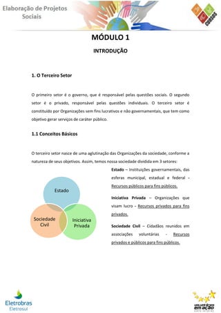 [1] O documento apresenta os conceitos básicos sobre o terceiro setor e organizações sem fins lucrativos, incluindo suas características e importância. [2] Discutem a definição de projetos sociais e a necessidade de planejamento para alcançar objetivos específicos dentro de limites de tempo e orçamento. [3] Destaca as quatro funções gerenciais cruciais para o desenvolvimento de projetos sociais: planejar, organizar, dirigir e controlar.