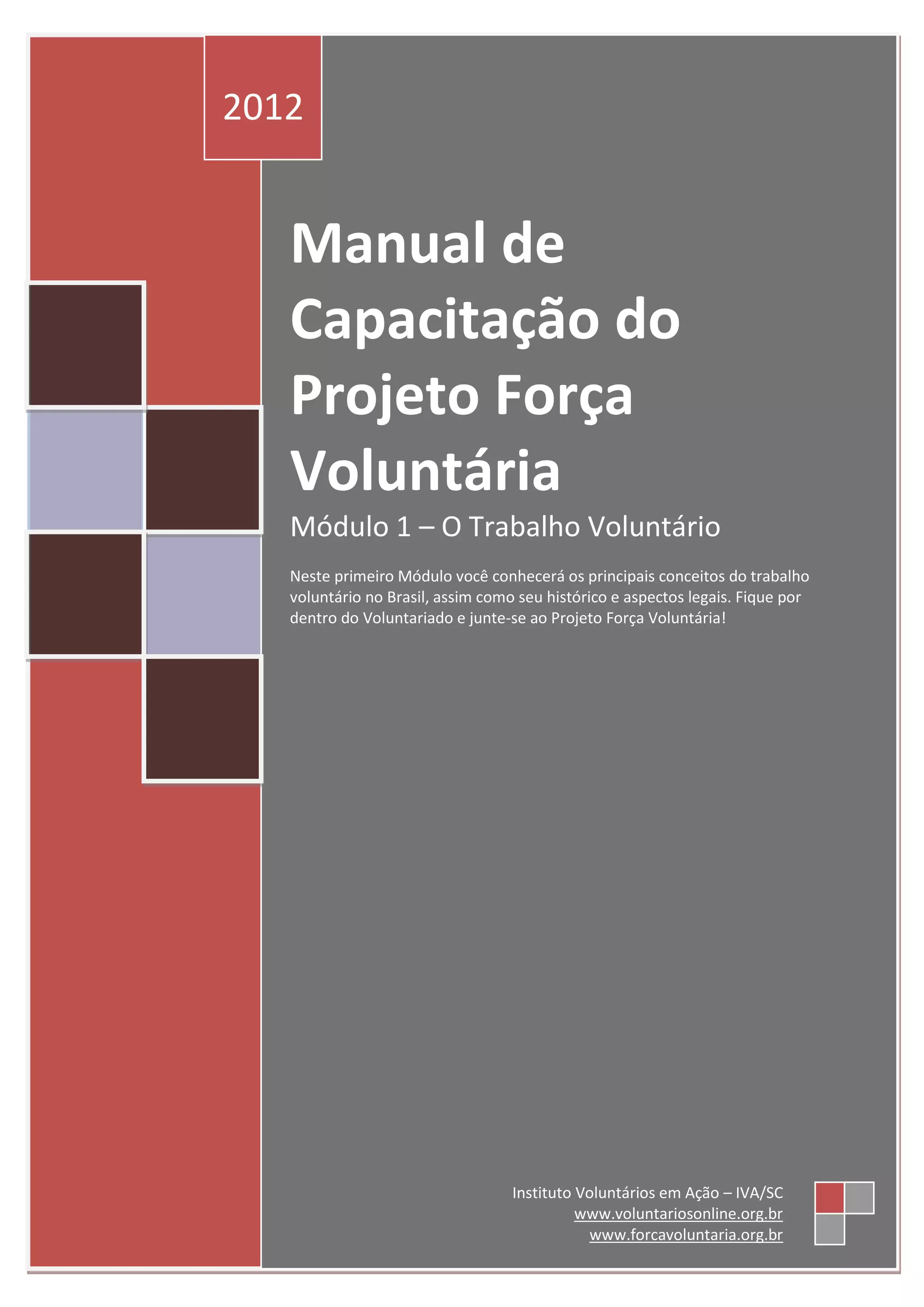 Este documento fornece um resumo sobre o trabalho voluntário no Brasil. Ele explica que o módulo 1 irá apresentar os principais conceitos e histórico do voluntariado no país, assim como seus aspectos legais, com o objetivo de capacitar voluntários para o Projeto Força Voluntária.