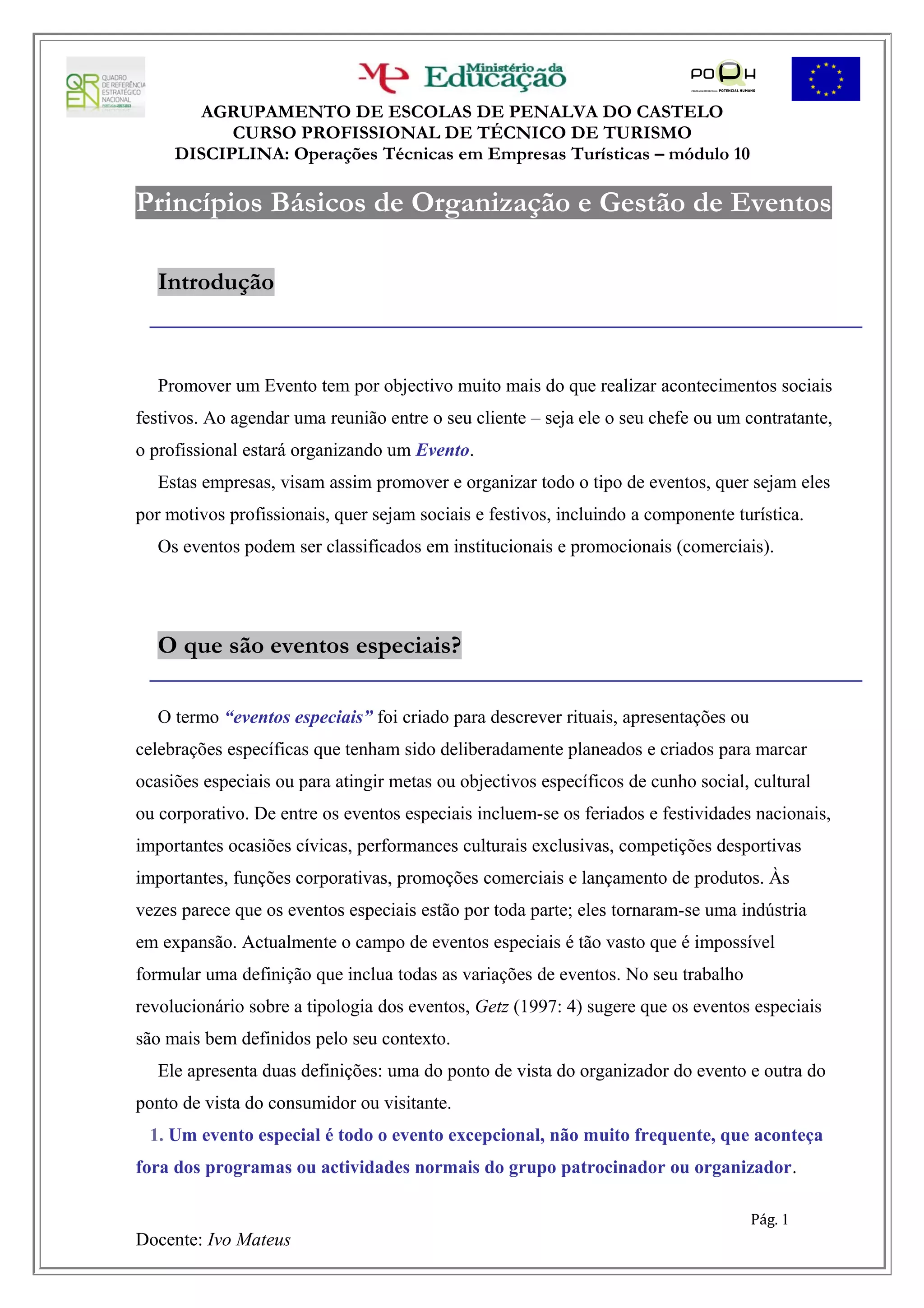 O documento discute os principais tipos e classificações de eventos. Eventos podem ser classificados como megaeventos, eventos de marca ou eventos comuns. Megaeventos são eventos de grande porte e notoriedade global, como Jogos Olímpicos. Eventos de marca tornam-se sinônimos de uma localidade. Vários tipos de eventos são discutidos, desde eventos sociais, desportivos e corporativos.