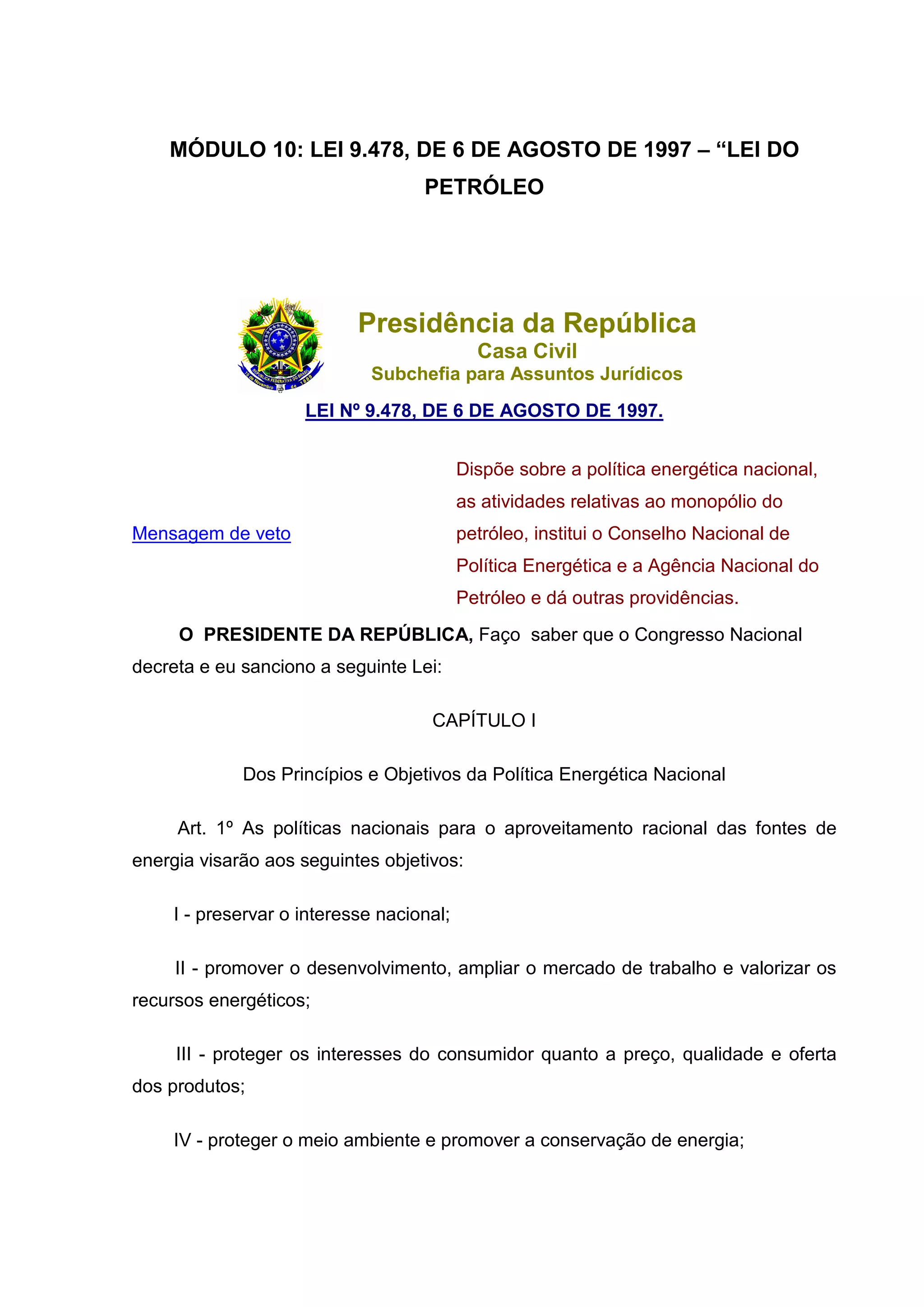 Este documento descreve a Lei 9.478/1997, conhecida como Lei do Petróleo, que estabelece a política energética nacional brasileira e regula as atividades relacionadas ao monopólio do petróleo. A lei cria o Conselho Nacional de Política Energética e a Agência Nacional do Petróleo e define termos técnicos relacionados ao petróleo e gás natural.