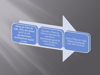 Este documento descreve um plano de aula para alunos do 6o ano com desempenho insatisfatório em matemática. O objetivo geral é identificar os conhecimentos matemáticos para compreender a realidade e resolver problemas. Os objetivos específicos incluem desenvolver habilidades como resolução de problemas e raciocínio matemático. As estratégias incluem aulas expositivas, jogos e discussões de textos sobre a história da matemática.