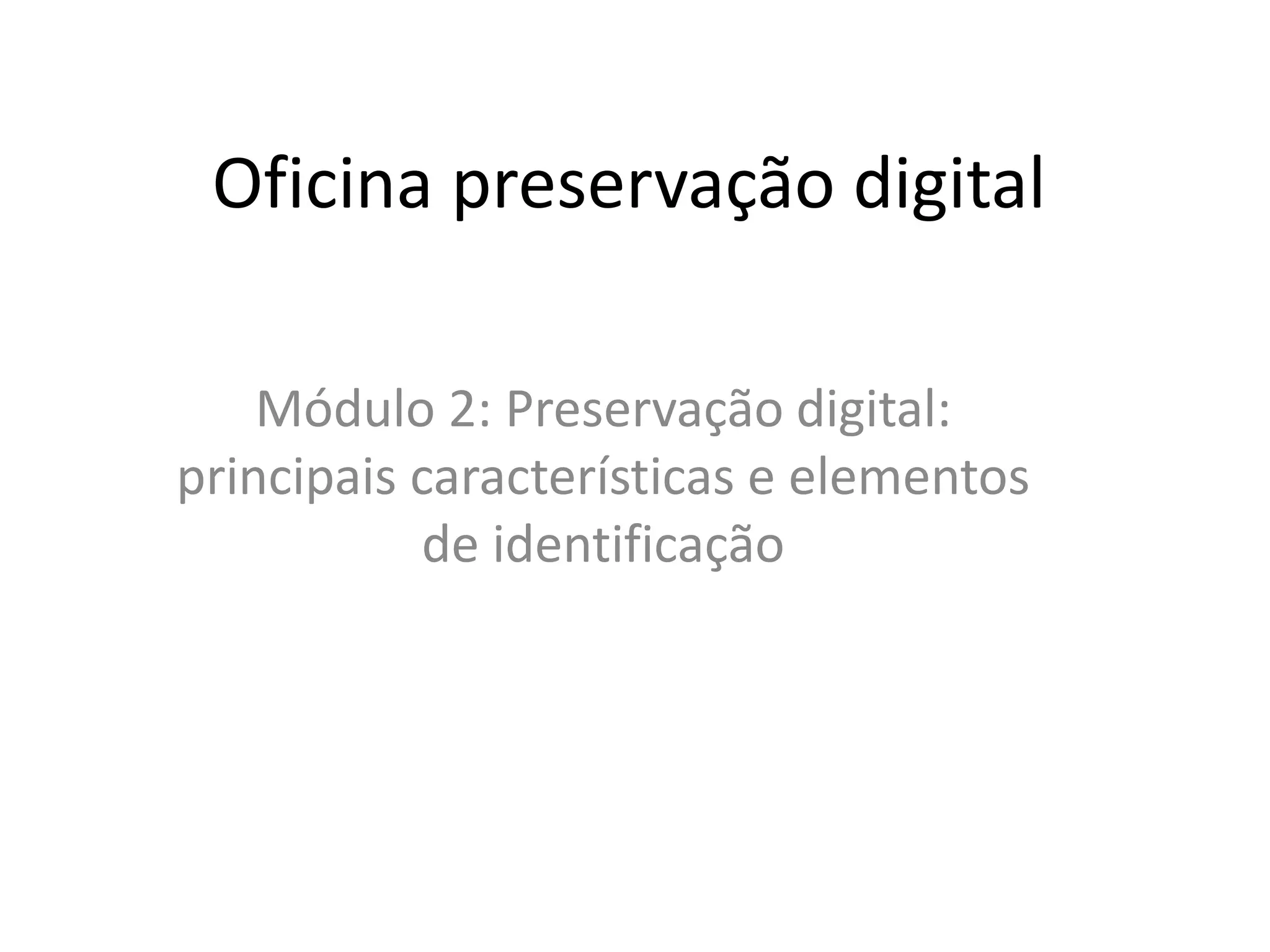 O documento discute a preservação digital de documentos, abordando suas principais características e elementos de identificação, como metadados e formatos digitais. É apresentado o processo de preservação na gestão eletrônica de documentos e características arquivísticas a serem consideradas, como fixidez, organicidade e autenticidade. Também são descritos suportes digitais como CDs, DVDs e dispositivos de memória USB usados nesse processo.