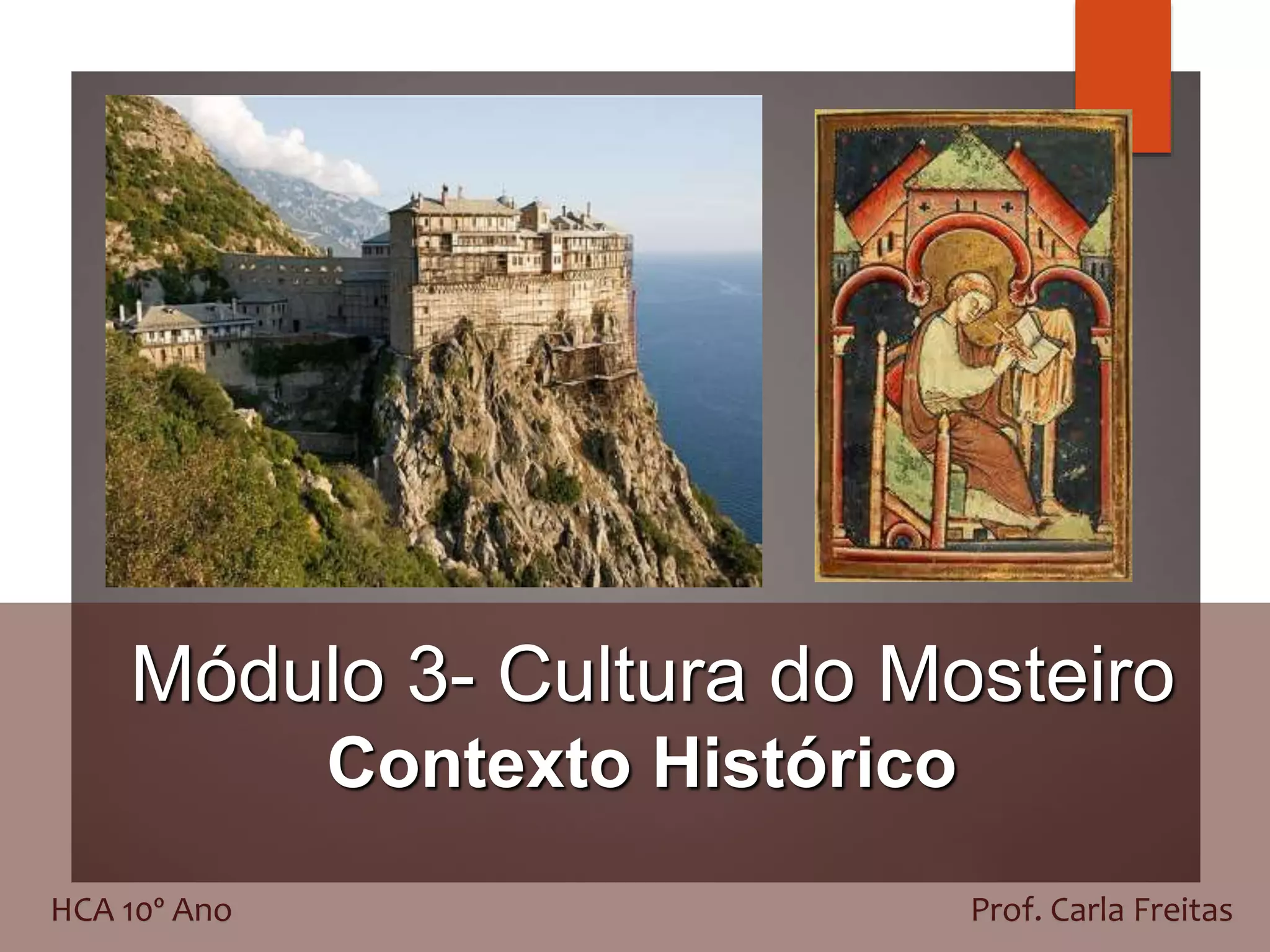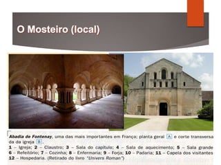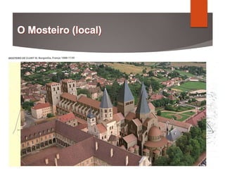 1) O documento discute a cultura dos mosteiros medievais entre os séculos IX e XI, quando desempenharam um papel importante na preservação do conhecimento clássico e no desenvolvimento cultural.