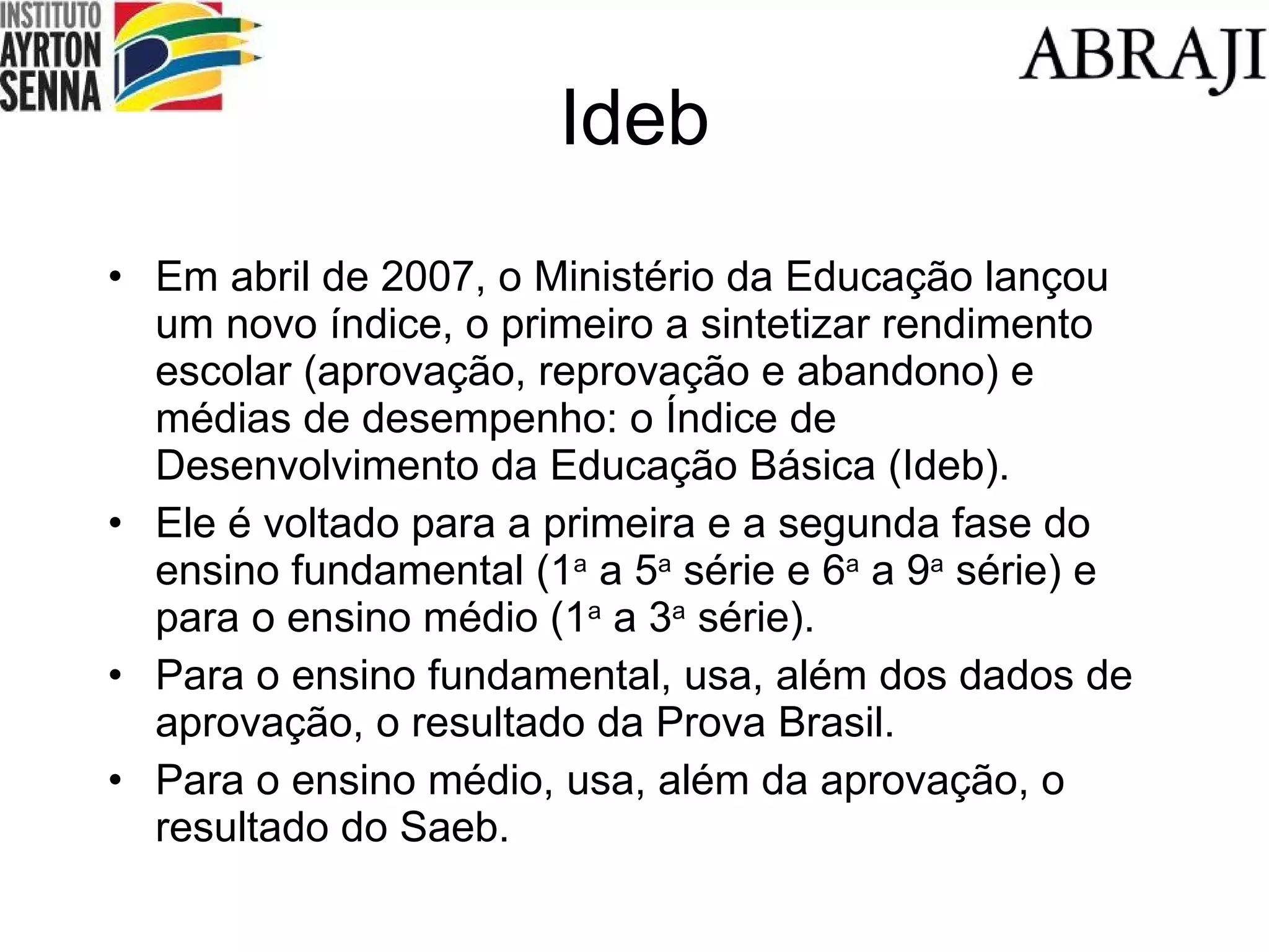 O documento descreve o Índice de Desenvolvimento da Educação Básica (Ideb), um índice criado pelo Ministério da Educação para medir a qualidade do ensino fundamental e médio no Brasil, levando em conta taxas de aprovação, reprovação e desempenho em exames nacionais. O texto explica como o Ideb é calculado e quais são suas metas para melhorar a educação brasileira até 2022.