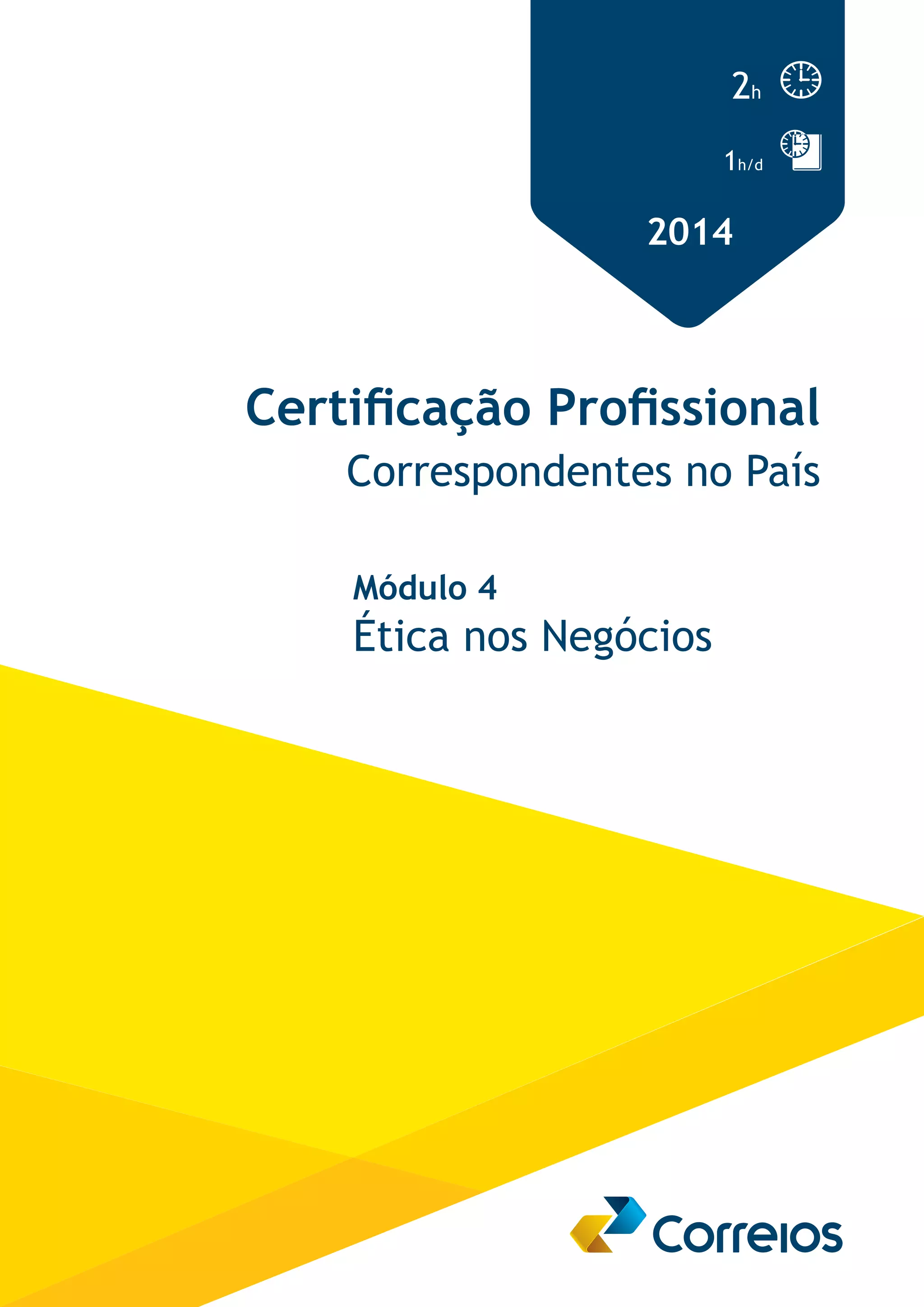 Este documento apresenta um módulo de um curso preparatório para certificação de correspondentes no país. O módulo aborda o tema da ética nos negócios, apresentando conceitos como Código de Defesa do Consumidor, direitos básicos do consumidor, práticas comerciais como oferta e publicidade, e práticas abusivas.