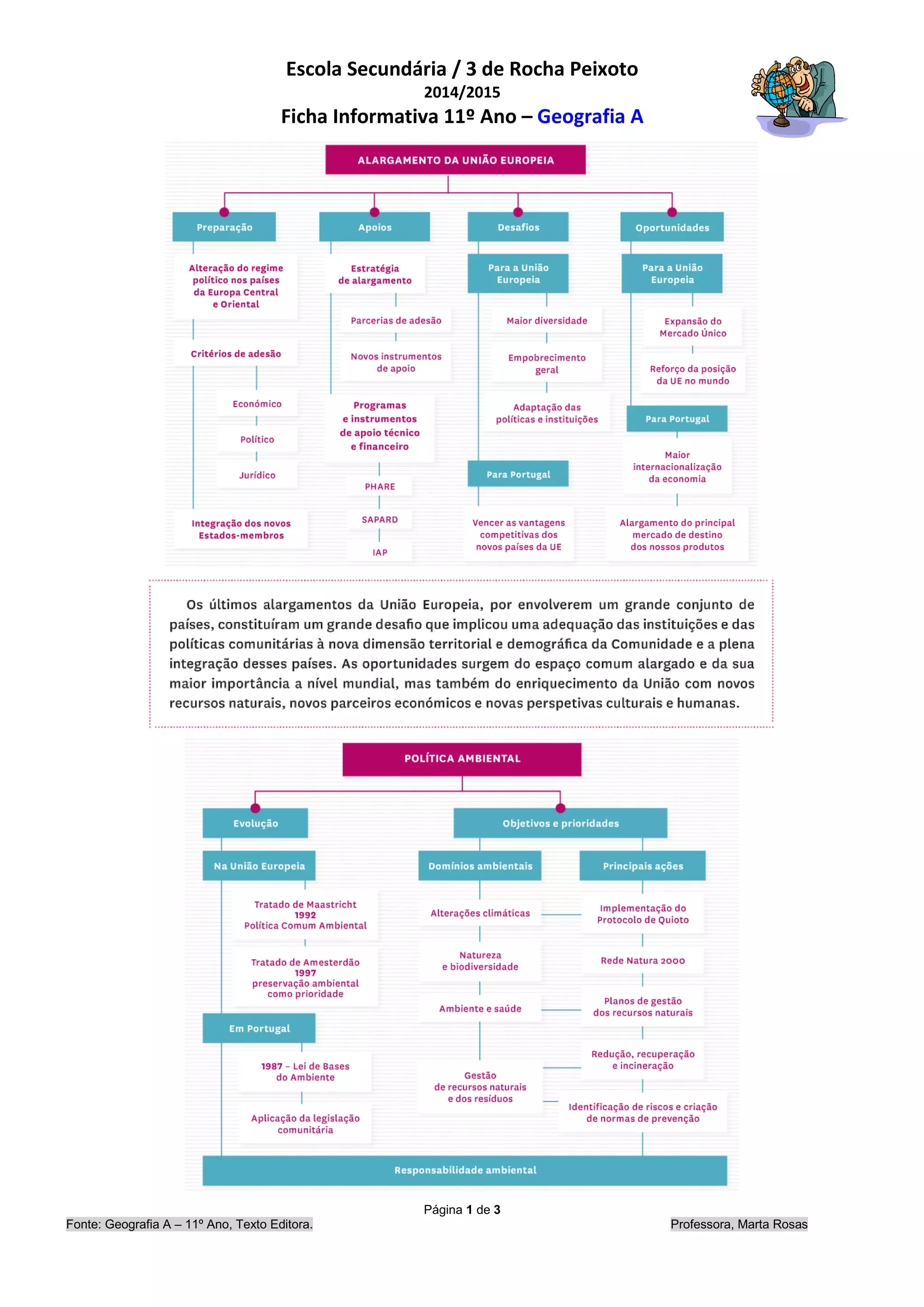 Este documento é uma ficha informativa para alunos do 11o ano de Geografia A na Escola Secundária / 3 de Rocha Peixoto para o ano letivo de 2014/2015. A ficha contém informações gerais sobre a disciplina extraídas do livro-texto "Geografia A – 11o Ano" da editora Texto sob a orientação da professora Marta Rosas.