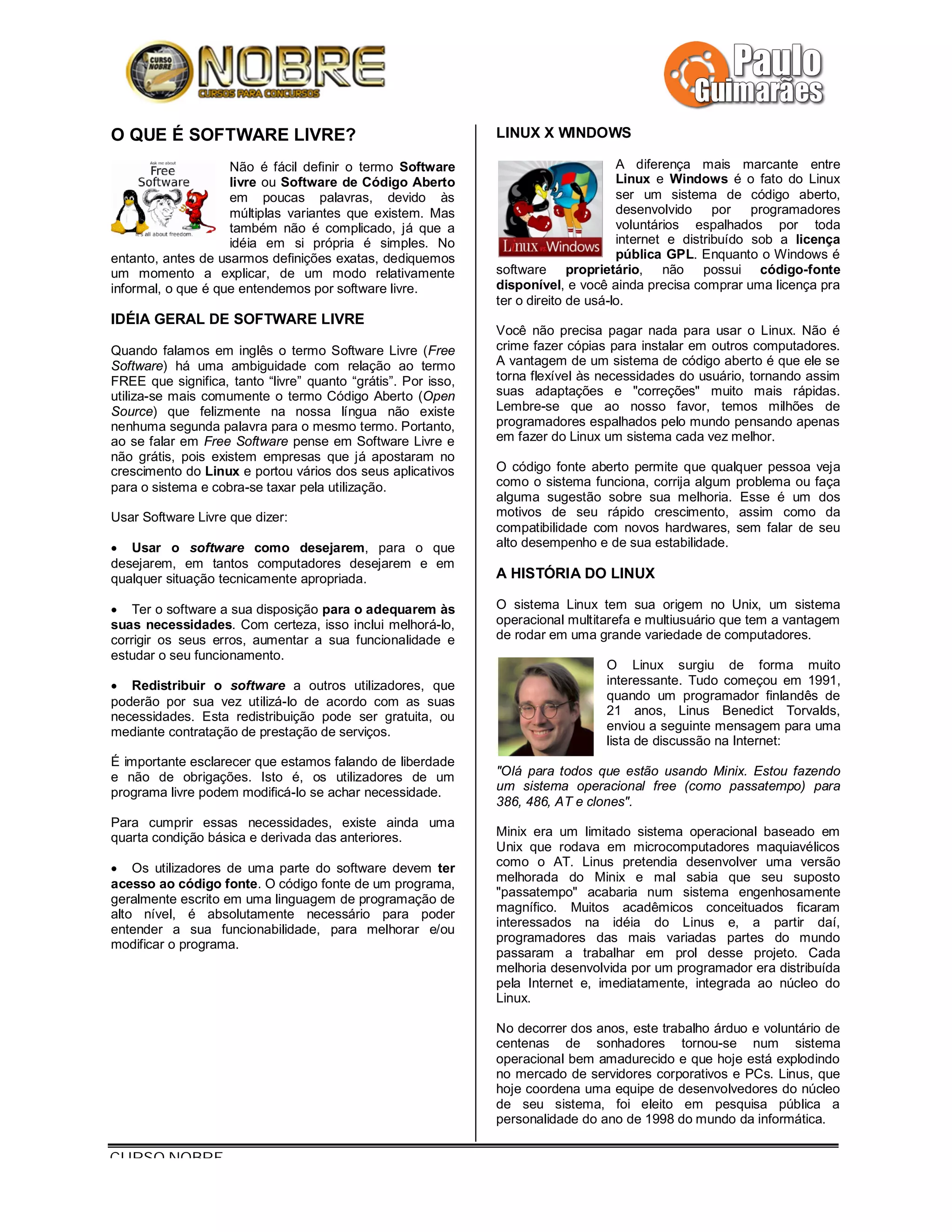 O documento discute o que é software livre e Linux. Software livre significa que os usuários têm liberdade de usar, modificar e redistribuir o software. Linux é um sistema operacional de código aberto desenvolvido por programadores voluntários e distribuído gratuitamente, diferentemente do Windows proprietário. O Linux funciona em diversas plataformas e tem vantagens como flexibilidade e segurança contra vírus.