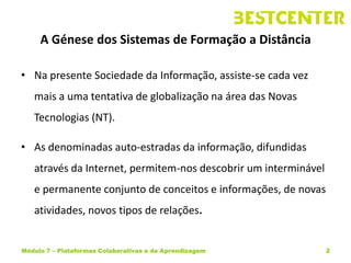 O documento descreve a evolução do ensino a distância através das gerações, desde o uso da correspondência até as plataformas online atuais. Começou no século 18 utilizando correspondência e rádio/TV, evoluiu para sistemas multimídia interativos e, atualmente, utiliza a internet para comunidades virtuais e aprendizagem móvel.