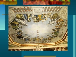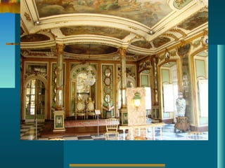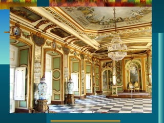 O documento descreve a arte Rococó, incluindo suas características, origem, contexto histórico e social, e sua expressão nas artes decorativas, arquitetura, escultura e pintura, com exemplos de obras em diversos países europeus como França, Itália, Alemanha, Áustria e Inglaterra.