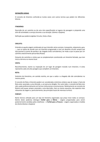 O documento discute itinerários e destinos turísticos. Apresenta definições de termos como itinerário, circuito e rota, e discute tipos de itinerários como desportivos, culturais, ecológicos e religiosos. Também aborda a elaboração de circuitos e itinerários turísticos levando em conta a oferta local e regional.