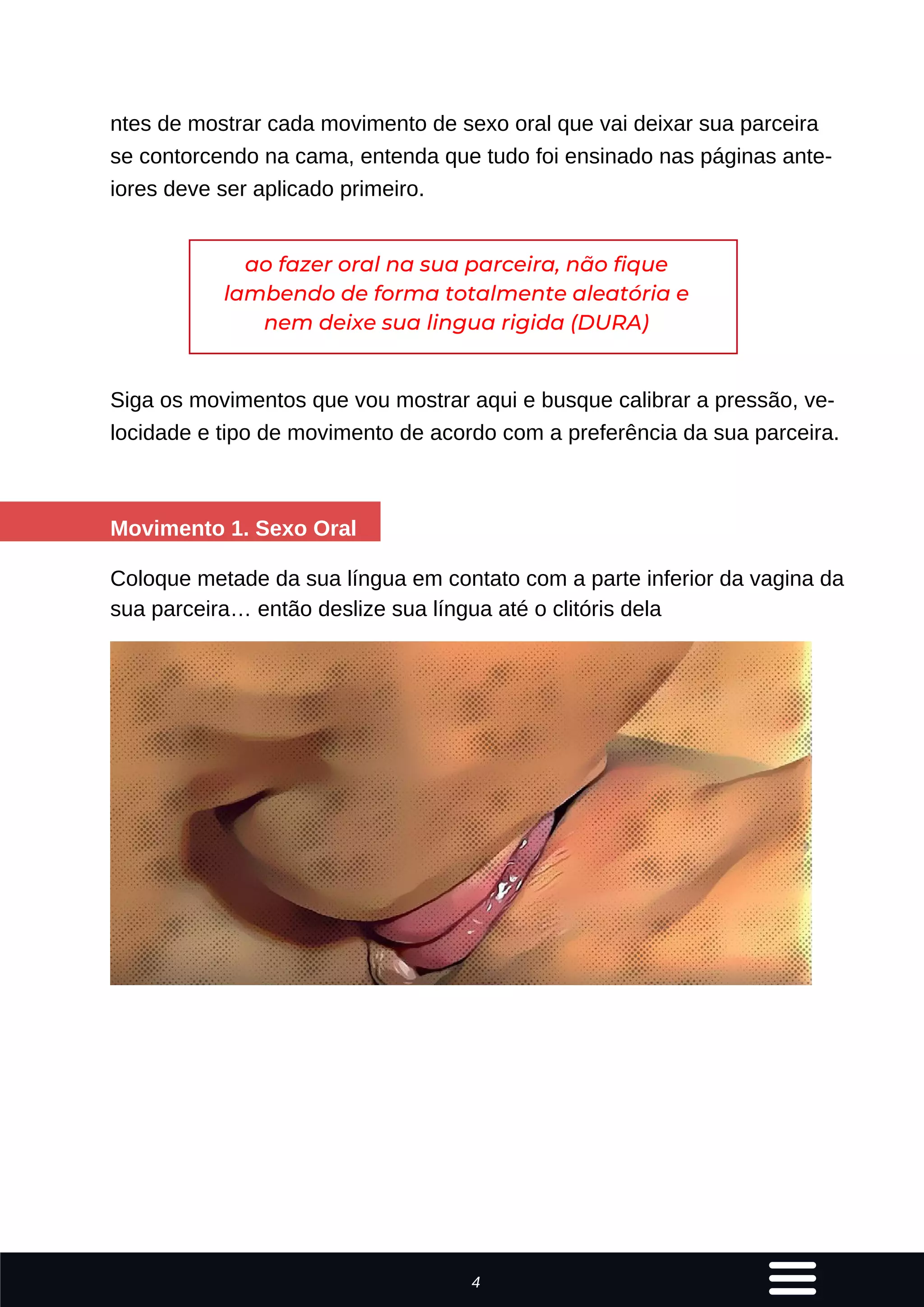 O documento fornece instruções sobre 4 movimentos de sexo oral para prazer feminino, descrevendo como usar a língua no clitóris e vagina e estimular o ponto G ao mesmo tempo. Reforça a importância de calibrar a pressão e velocidade de acordo com a preferência da parceira para proporcionar orgasmos intensos.