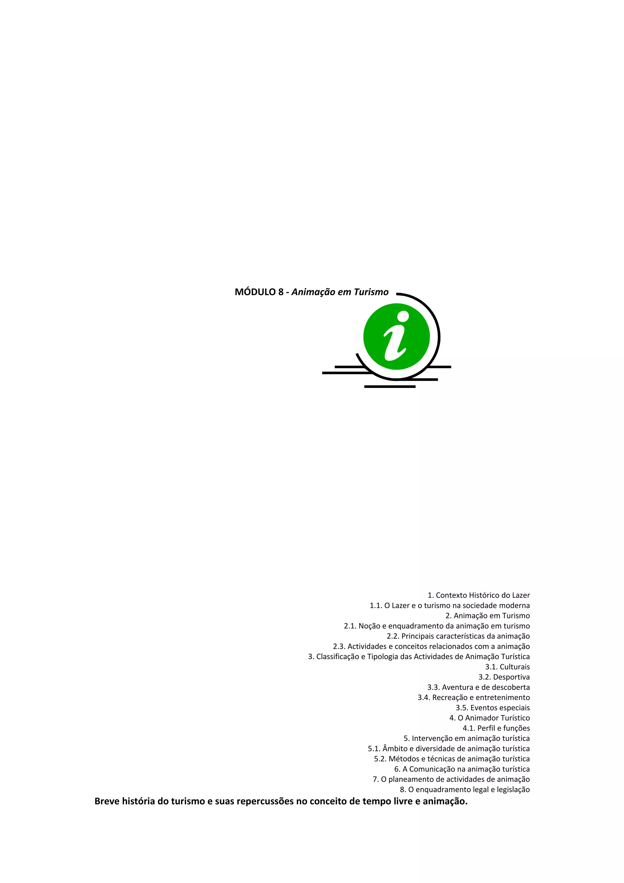 O documento discute a animação no turismo, começando com o contexto histórico do lazer e turismo e como eles evoluíram na sociedade moderna. Em seguida, define animação turística e discute suas principais características e atividades relacionadas. Por fim, classifica e tipifica diferentes atividades de animação turística.