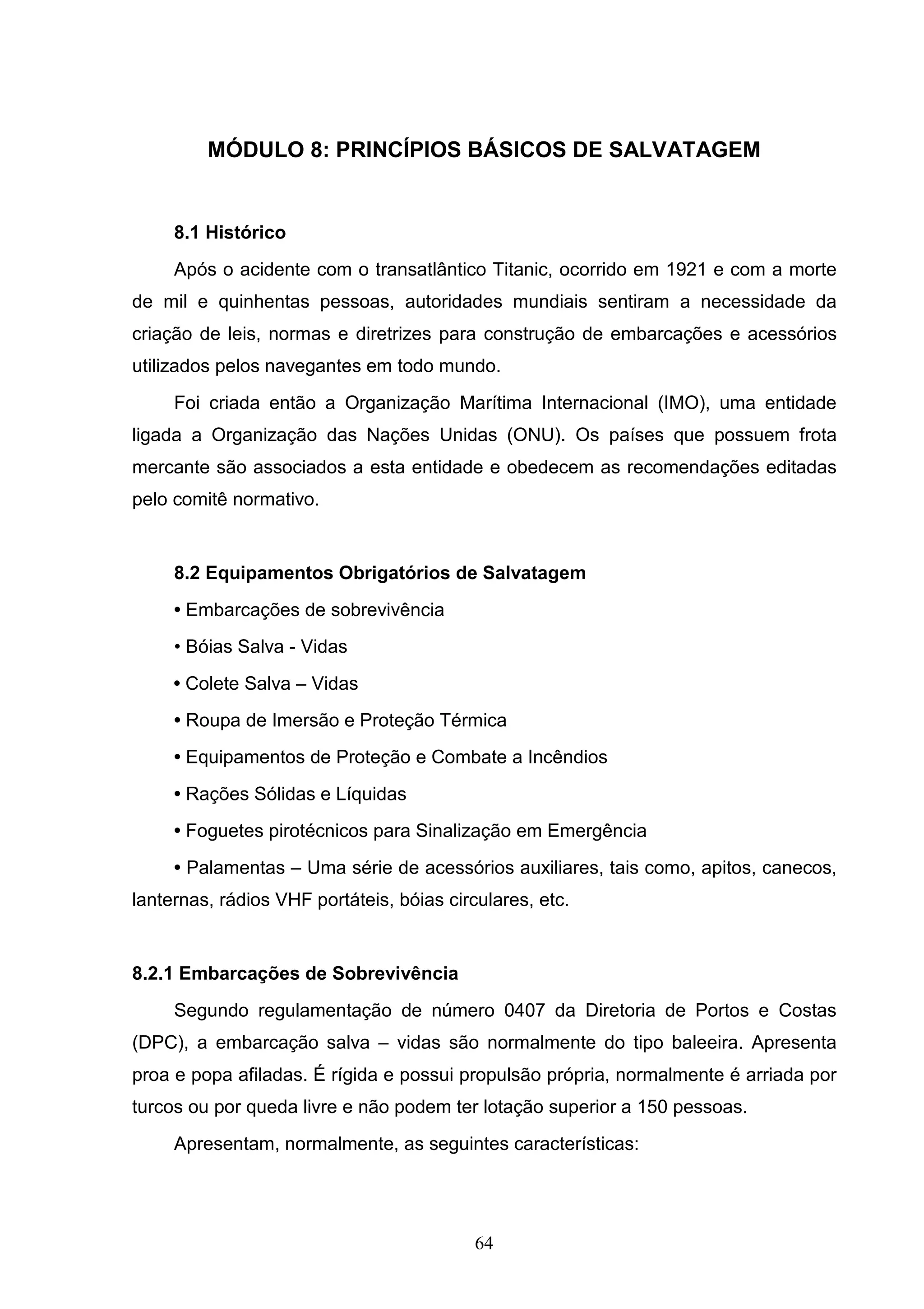 O documento descreve os principais equipamentos de salvamento obrigatórios em embarcações como balsas salva-vidas, boias salva-vidas, coletes salva-vidas e equipamentos de proteção contra incêndio. Também discute a história da regulamentação de segurança marítima após o naufrágio do Titanic e as organizações responsáveis por estabelecer normas internacionais.