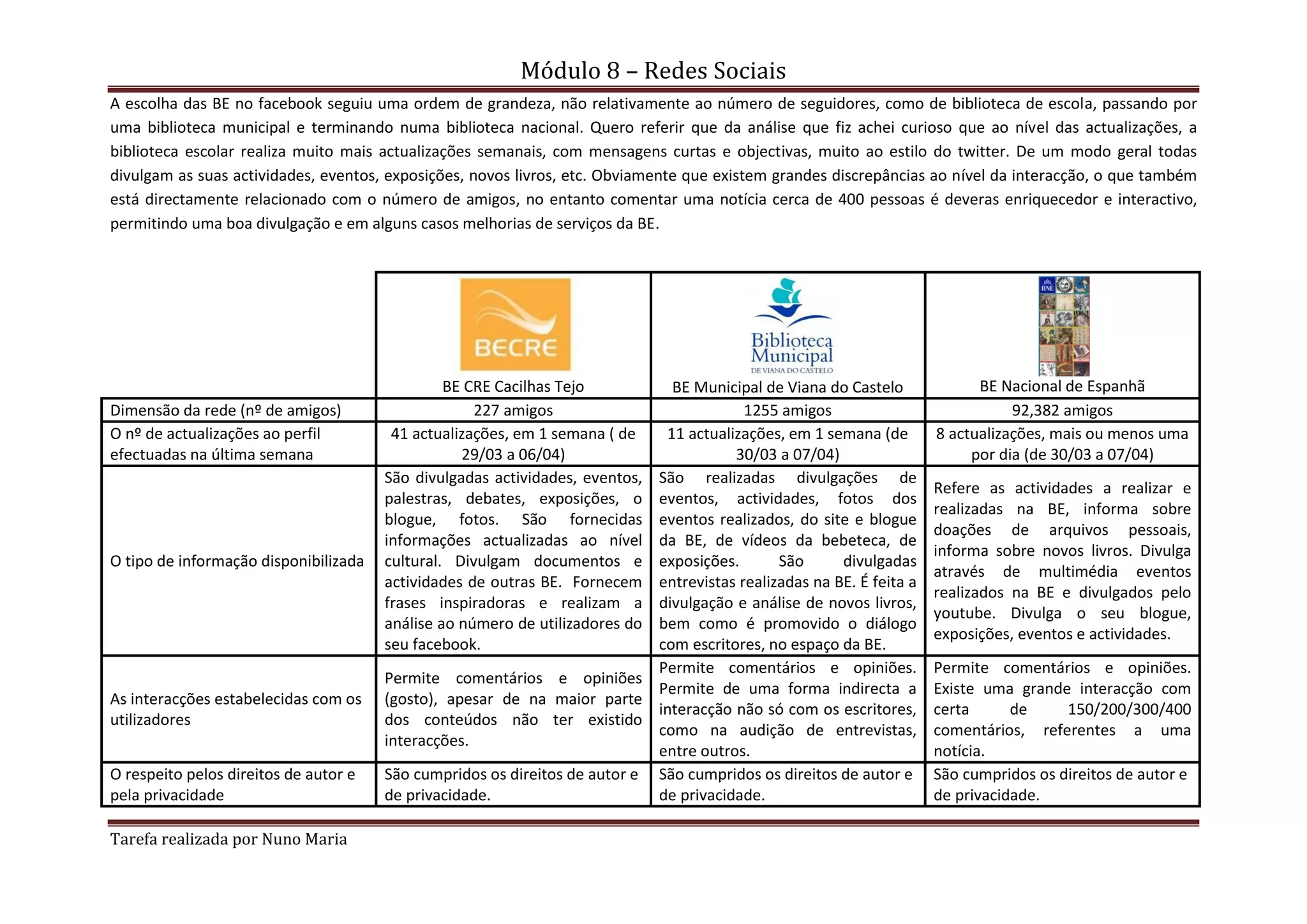 [1] O documento analisa as páginas do Facebook de três bibliotecas - uma escolar, uma municipal e uma nacional - comparando o tamanho da rede, frequência de atualizações, tipo de informação e nível de interação.