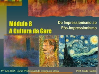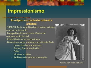 Este documento descreve os movimentos artísticos do Impressionismo e Pós-Impressionismo, incluindo suas características e principais artistas. Começa com uma introdução ao Impressionismo, abordando seus pioneiros como Manet, Monet, Renoir e Degas, e suas técnicas como pintura em plein air e o uso da cor. Em seguida, discute o Neoimpressionismo e seus principais representantes Seurat, Signac e Pissarro. Por fim, apresenta o Pós-Impressionismo e artistas como Van Gogh, Céz