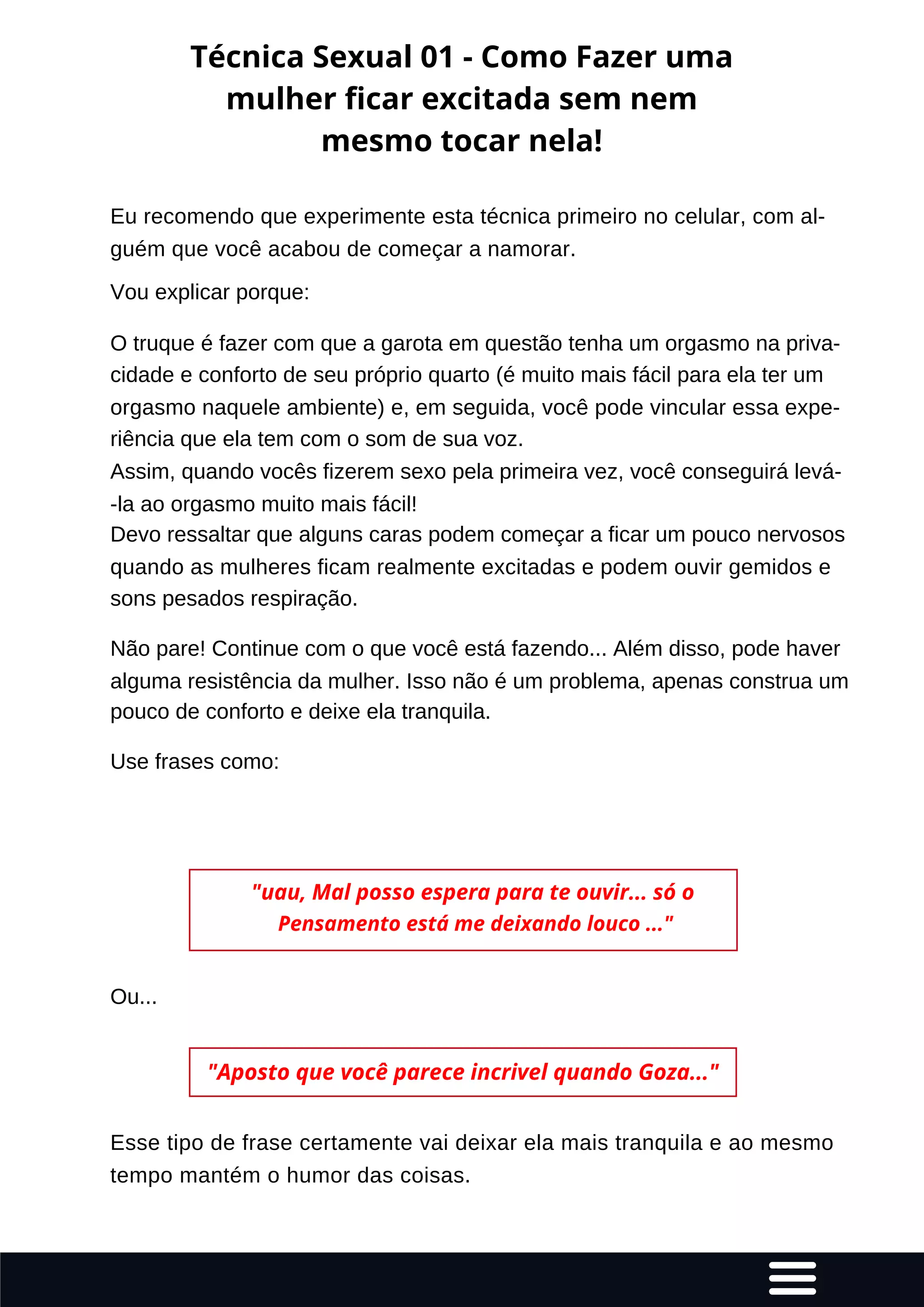 O documento fornece várias técnicas sexuais para aumentar o prazer feminino, incluindo estimulação por voz, toque e posições. Recomenda ancorar experiências prazerosas na mente da parceira através de estímulos consistentes para permitir reativação futura. Também descreve posições como "cachorrinho" e "gato" para maximizar o contato com áreas sensíveis.