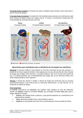 O documento descreve os sistemas de transporte nos animais, incluindo os fluidos circulantes, órgãos propulsores e vasos de transporte. Discutem-se os sistemas de transporte aberto e fechado, e os tipos de circulação encontrados nos vertebrados, como a circulação simples, dupla incompleta e dupla completa. O papel do sangue e da linfa no transporte de nutrientes e remoção de resíduos entre as células é explicado.