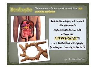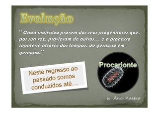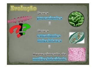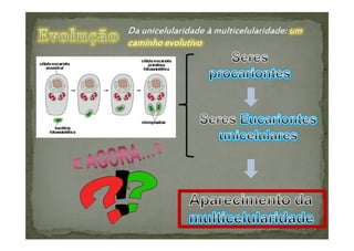 O documento discute a evolução das células eucarióticas a partir de células procarióticas. Apresenta dois modelos para explicar esta evolução: o modelo autogénico e o modelo endossimbiótico. O modelo endossimbiótico sugere que as células eucarióticas resultaram da incorporação de bactérias por outras células, levando à diferenciação de organelas como mitocôndrias e cloroplastos.