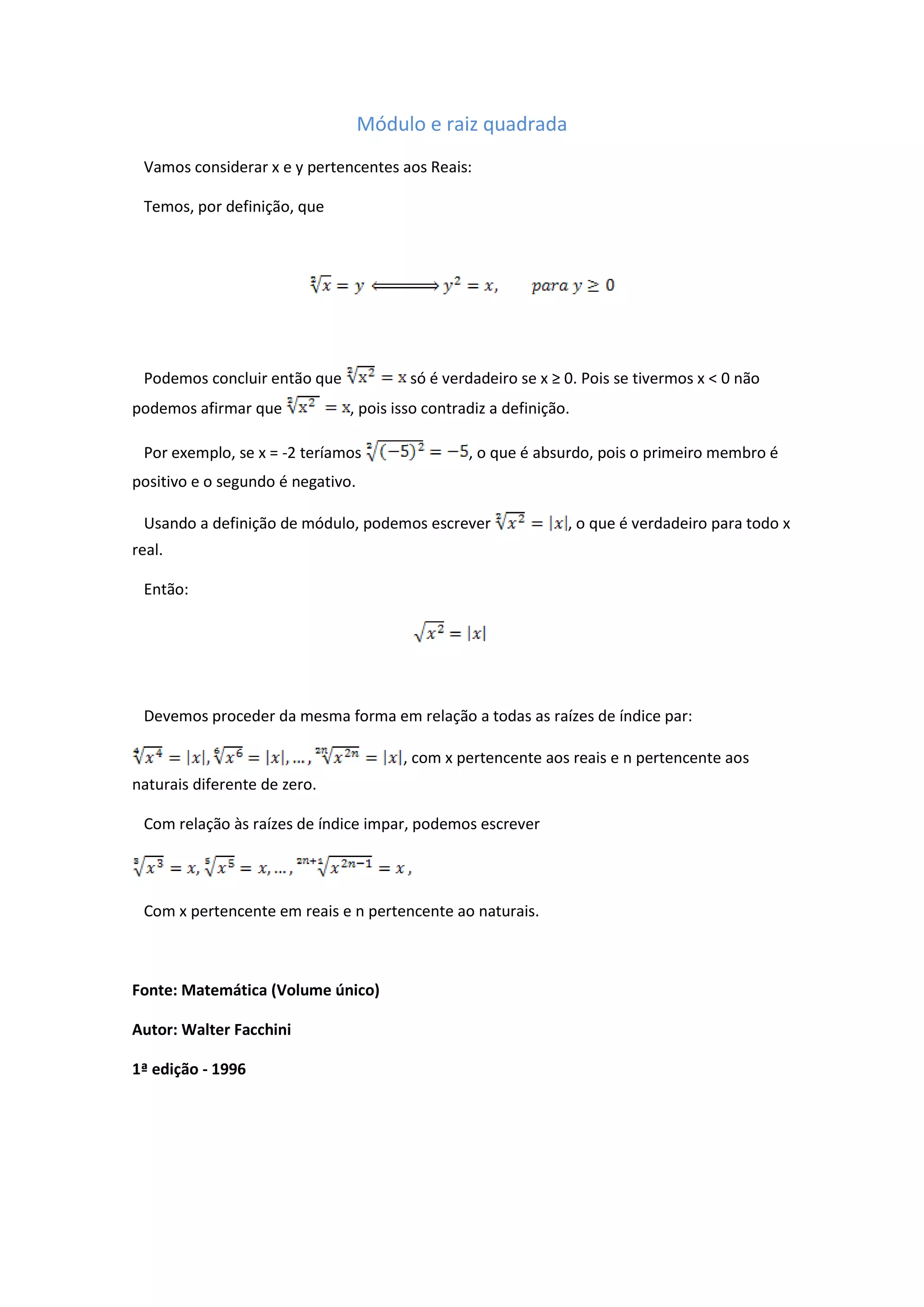 O documento discute as definições de módulo e raiz quadrada, explicando que a raiz quadrada só é válida para números reais não-negativos devido à definição de módulo. Ele também generaliza essa propriedade para raízes de qualquer índice par ou ímpar.