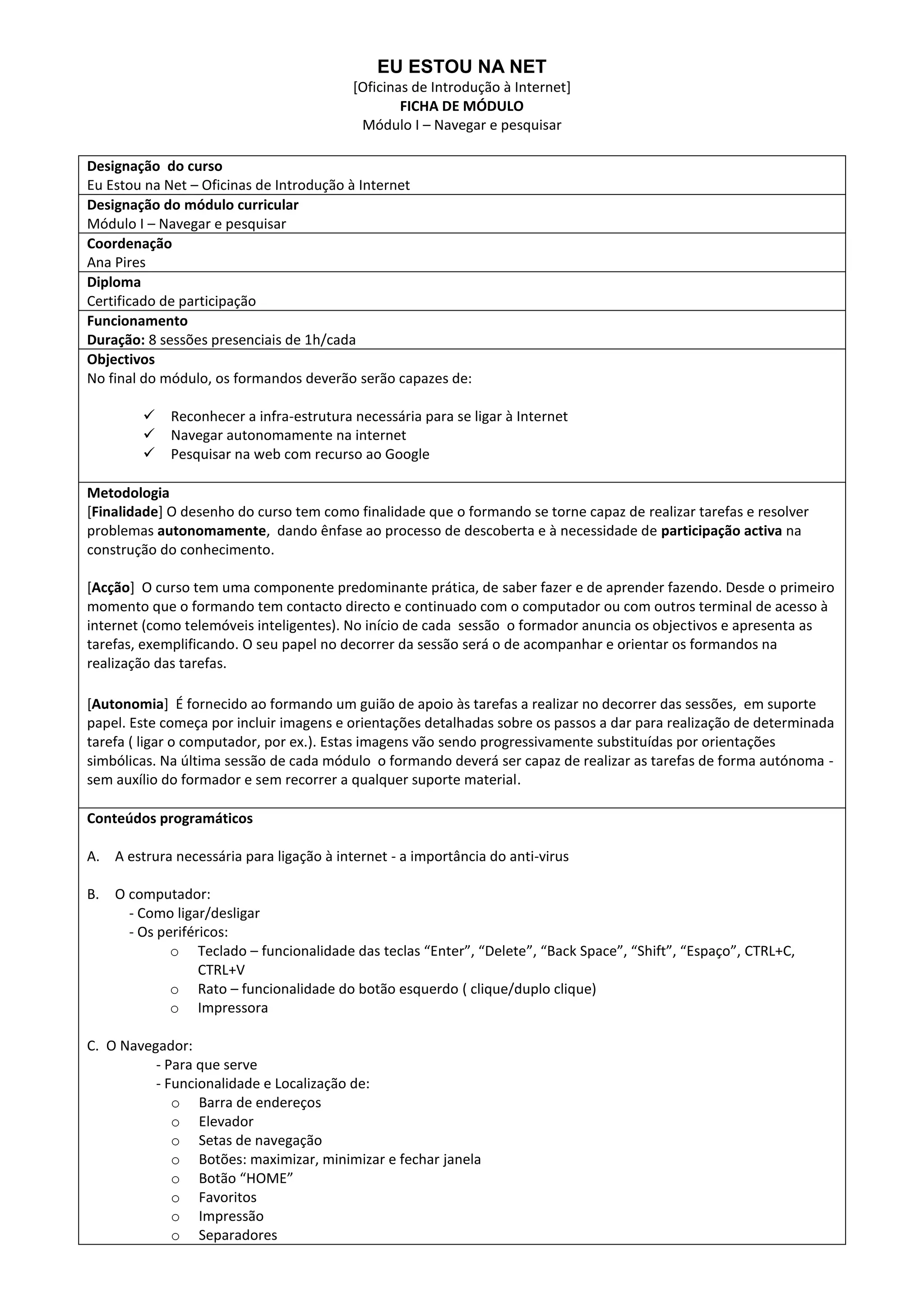 Este documento fornece informações sobre um curso introdutório à internet chamado "Eu Estou na Net". O Módulo I foca em ensinar os alunos a navegar e pesquisar na internet em 8 sessões. Os alunos aprenderão como ligar computadores, usar navegadores, realizar pesquisas no Google e selecionar, copiar e traduzir informações online.