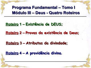 O documento apresenta um resumo sobre o módulo III do livro "Programa Fundamental - Tomo I" da Federação Espírita Brasileira, que trata sobre Deus. O módulo discute a existência e atributos de Deus através de 4 roteiros e cita uma poesia de Antero de Quental que descreve Deus como eterno, imutável, imaterial, único e onipotente. Finalmente, destaca que Jesus nos apresentou a Deus como um Pai amoroso e justo.