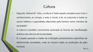 O documento discute a definição de cultura e arte. Cultura é definida como tudo que é adquirido como membro da sociedade, incluindo conhecimento, crenças, arte e costumes. Arte é a capacidade humana de criar obras para expressar ideias através de suportes como arquitetura, escultura e pintura. A história da arte estuda produções artísticas para explicar sua importância cultural e histórica.