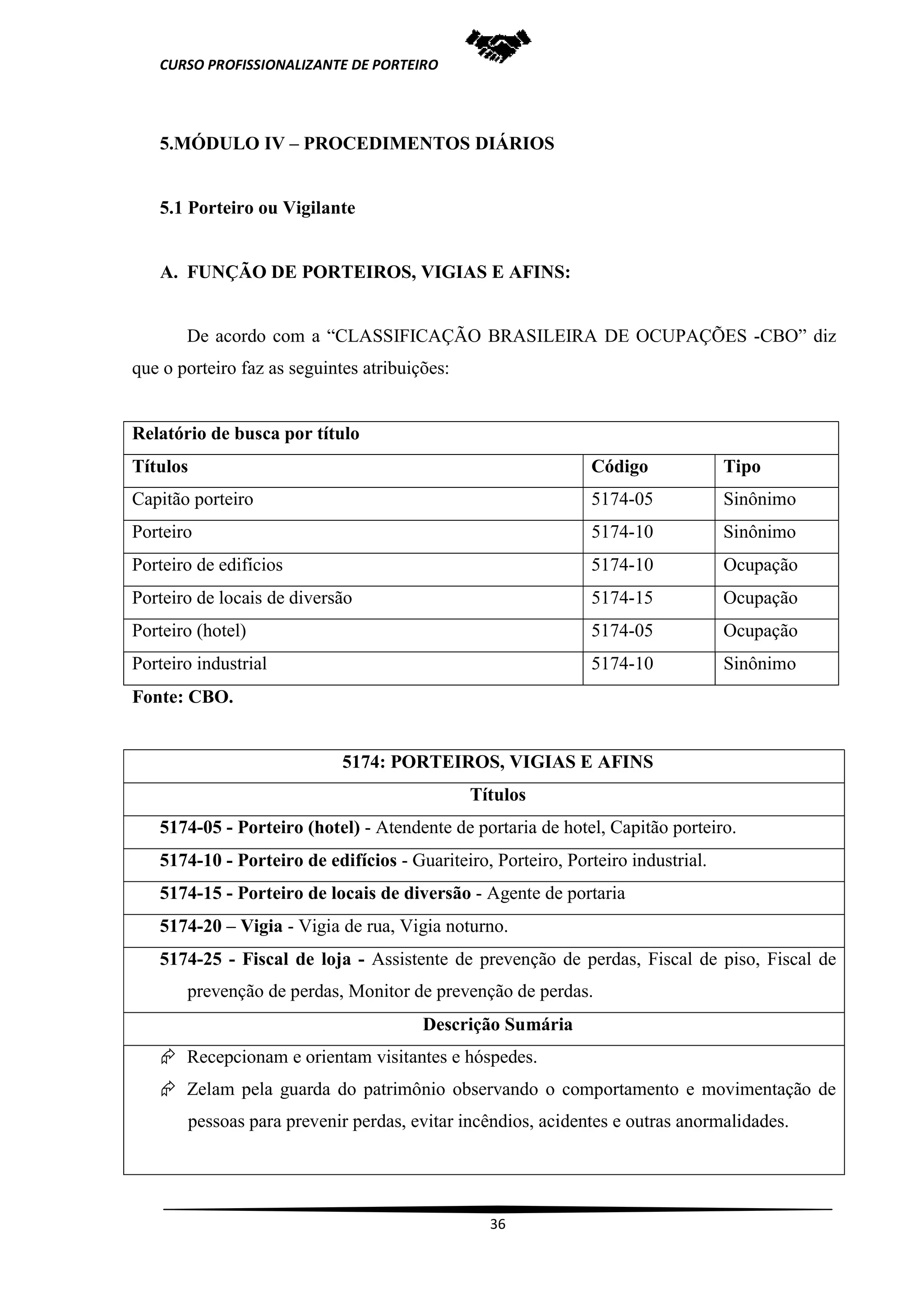 1) O documento descreve as funções de porteiro e vigilante de acordo com a Classificação Brasileira de Ocupações (CBO).
