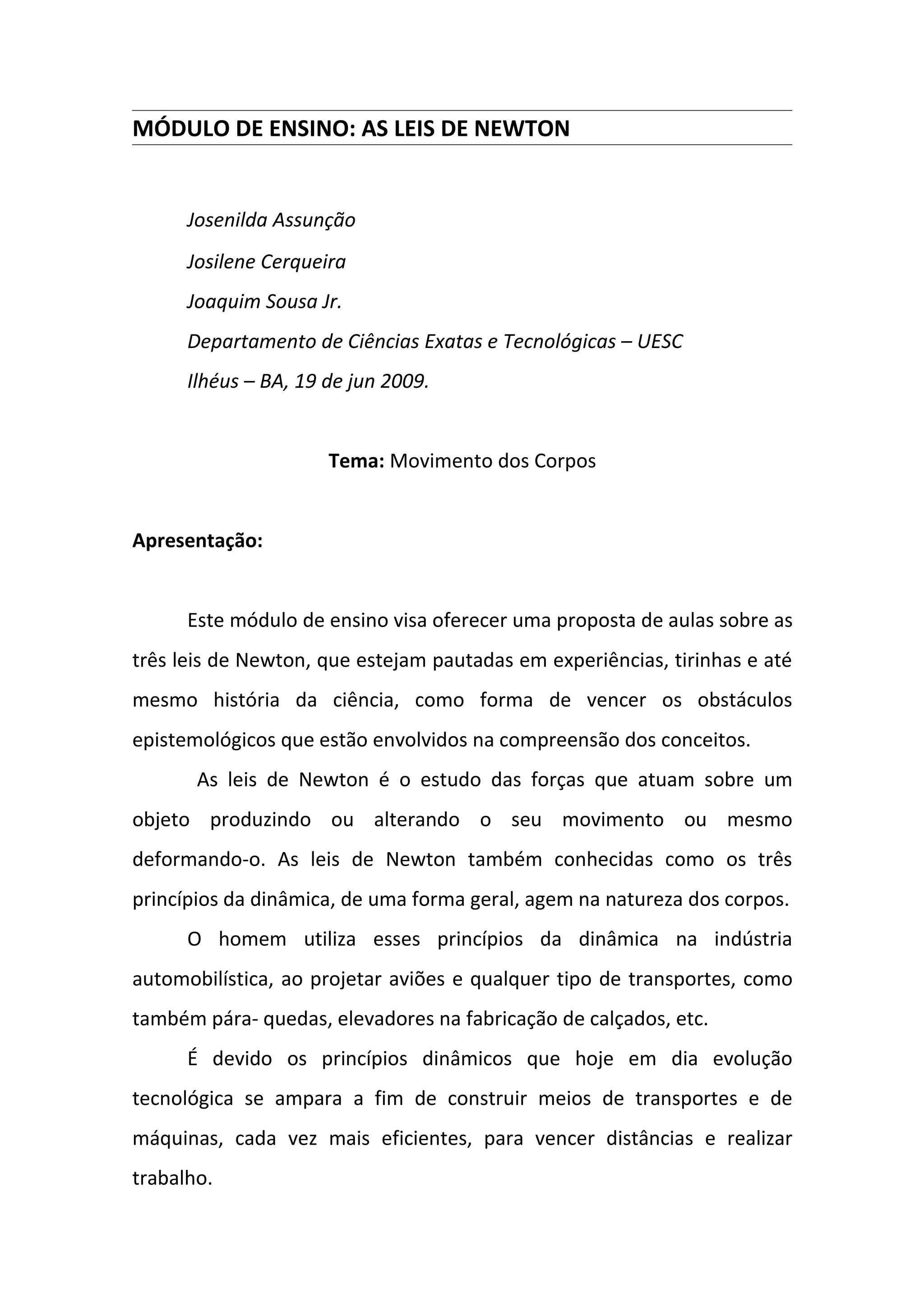 Este documento apresenta um módulo de ensino sobre as leis de Newton para alunos do ensino fundamental e médio. O módulo contém 7 aulas com atividades experimentais e discussões para ajudar os alunos a compreenderem conceitos como movimento, força, massa e inércia. As aulas abordam cada uma das três leis de Newton de forma interativa e relacionada ao cotidiano dos alunos.