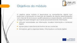 Este módulo visa desenvolver competências digitais de processamento de informação para adultos desempregados com mais de 45 anos através de aprendizagens sobre localização, avaliação e organização de dados online. O objetivo é facilitar a reinserção no mercado de trabalho.