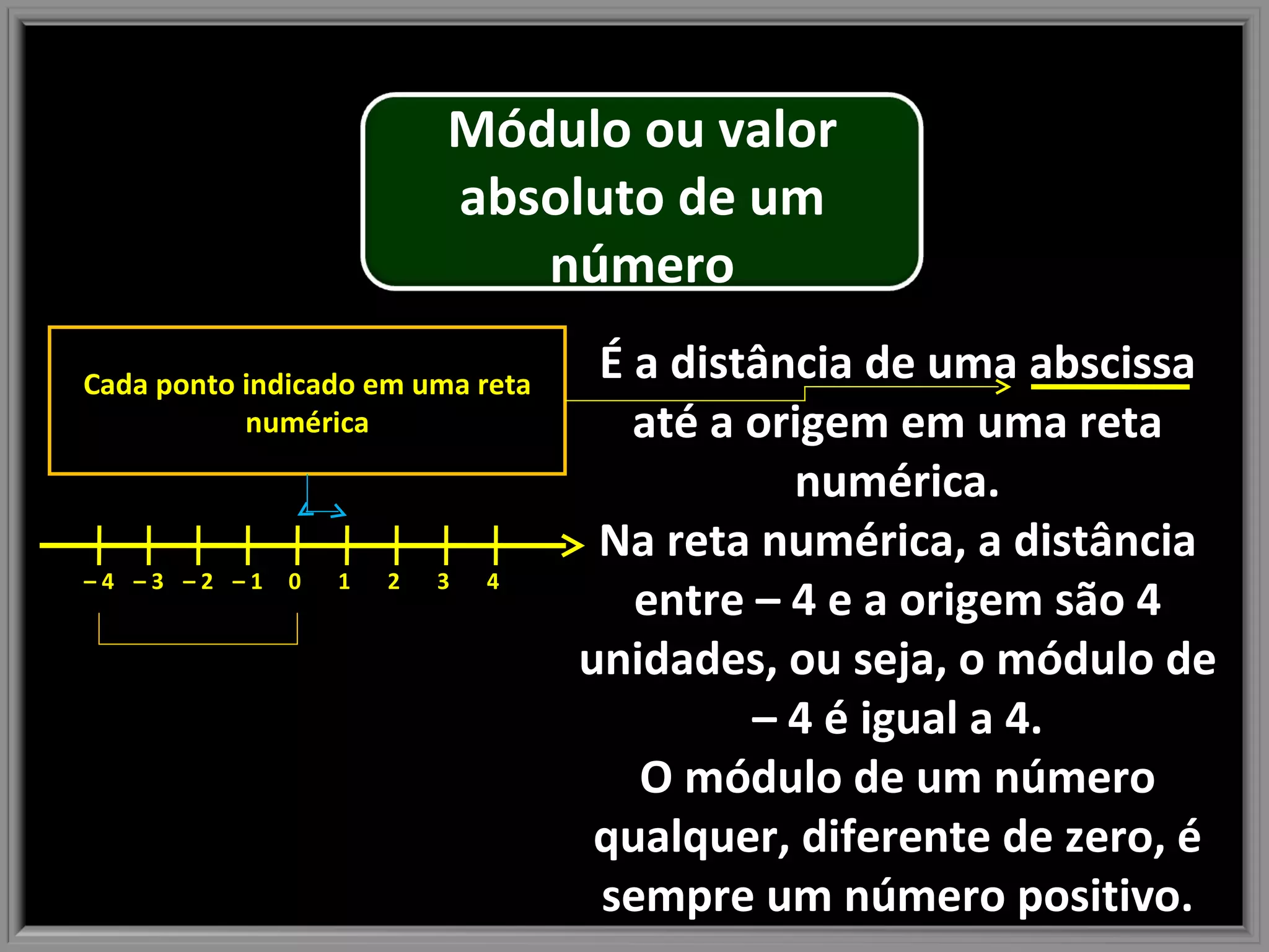 O módulo ou valor absoluto de um número é a distância desse número até a origem na reta numérica. O módulo de um número é sempre positivo, então o módulo de -4 é 4. O módulo mede a distância de um ponto até a origem na reta numérica.