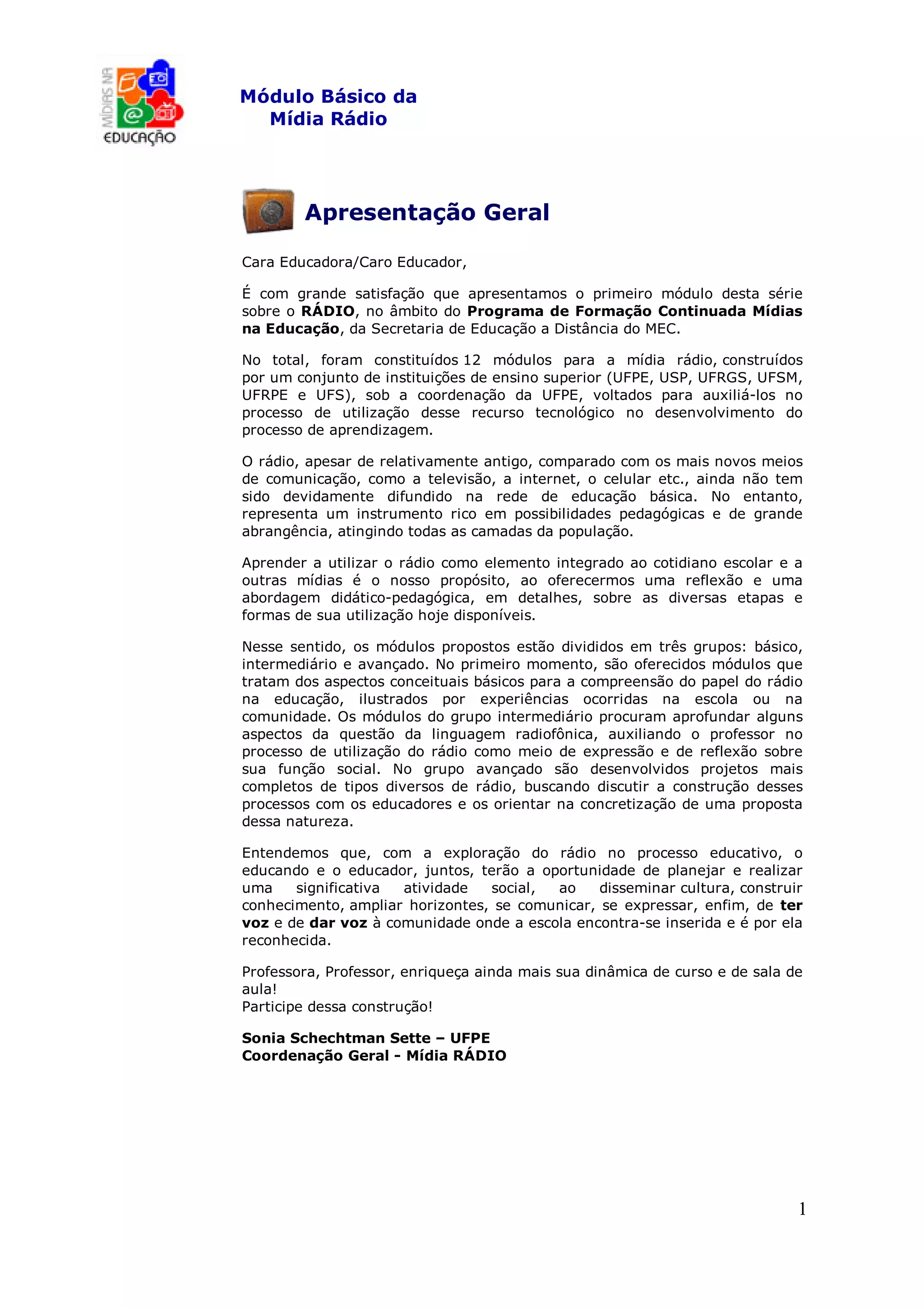 1. O documento apresenta o primeiro módulo de uma série sobre rádio no âmbito de um programa de formação continuada para educadores, com o objetivo de auxiliá-los na utilização do rádio no processo de aprendizagem.
