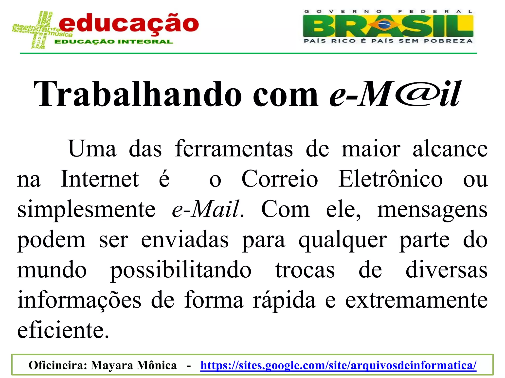 O documento discute o e-mail, explicando que é uma ferramenta que permite troca rápida de informações em todo o mundo. Detalha como funciona um sistema de e-mail, incluindo endereços de e-mail, cabeçalhos e corpos de mensagens. Também menciona webmail e lista alguns provedores populares.