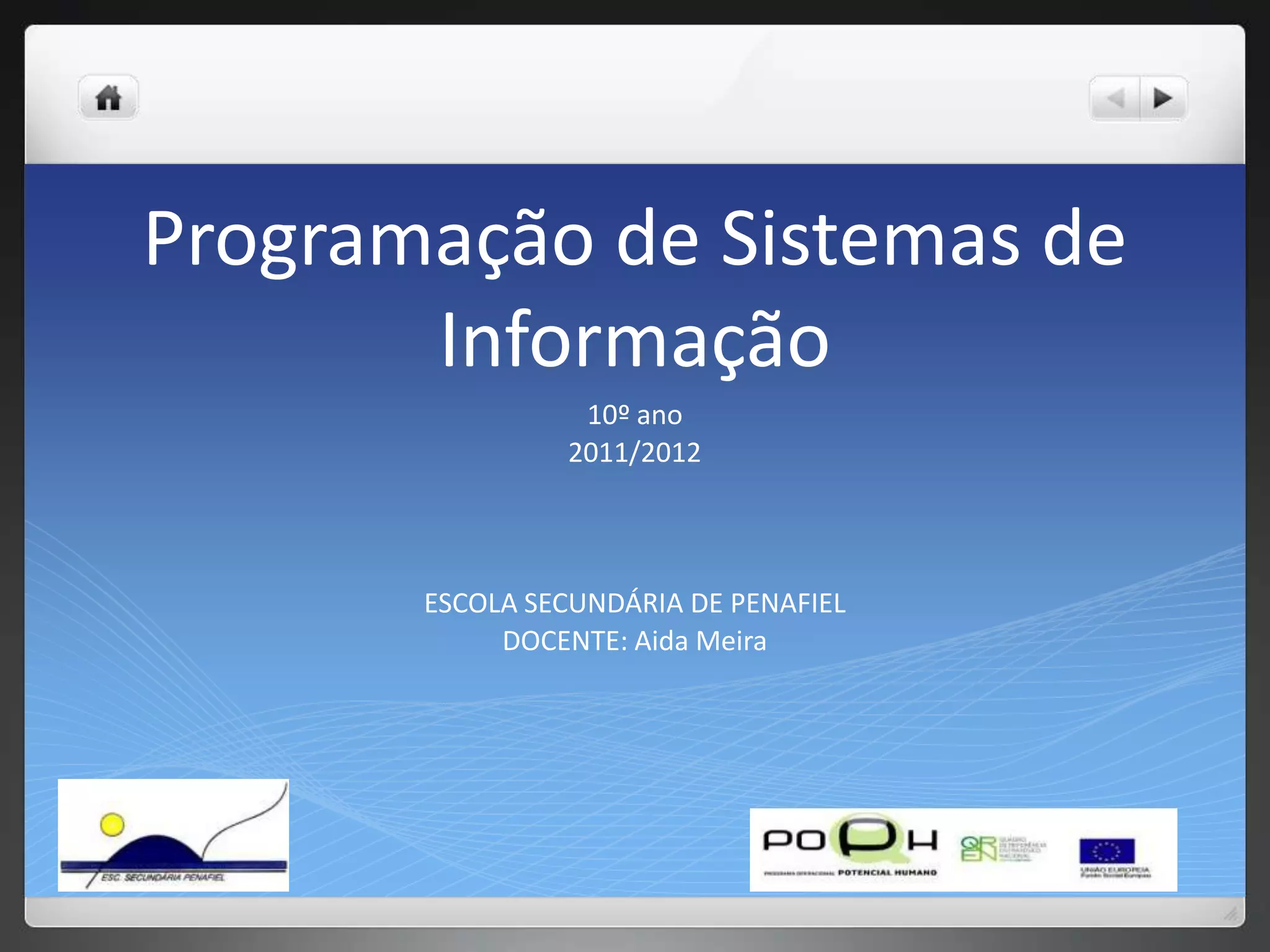 Este documento apresenta os conteúdos programados para o 10o ano de Programação de Sistemas de Informação, incluindo: 1) introdução à lógica de programação, algoritmos e desenvolvimento de algoritmos; 2) constantes, variáveis e tipos de dados; 3) operadores e funções; e 4) teste e correção de erros.