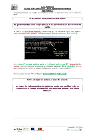 Este documento discute conceitos fundamentais de endereços IP, incluindo: (1) O que é um endereço IP e como ele identifica dispositivos em uma rede; (2) Os diferentes tipos de redes públicas e privadas; (3) Como o espaço de endereços IP é dividido em classes A, B, C, D e E.
