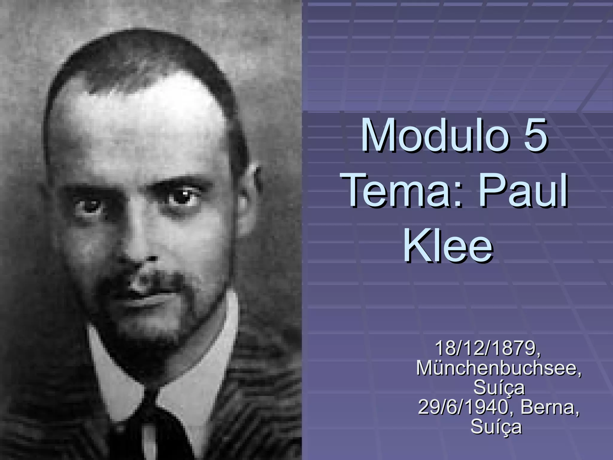 Paul Klee nasceu em 1879 na Suíça e faleceu em 1940 também na Suíça, sendo um pintor suíço que viveu quase toda sua vida em seu país natal.