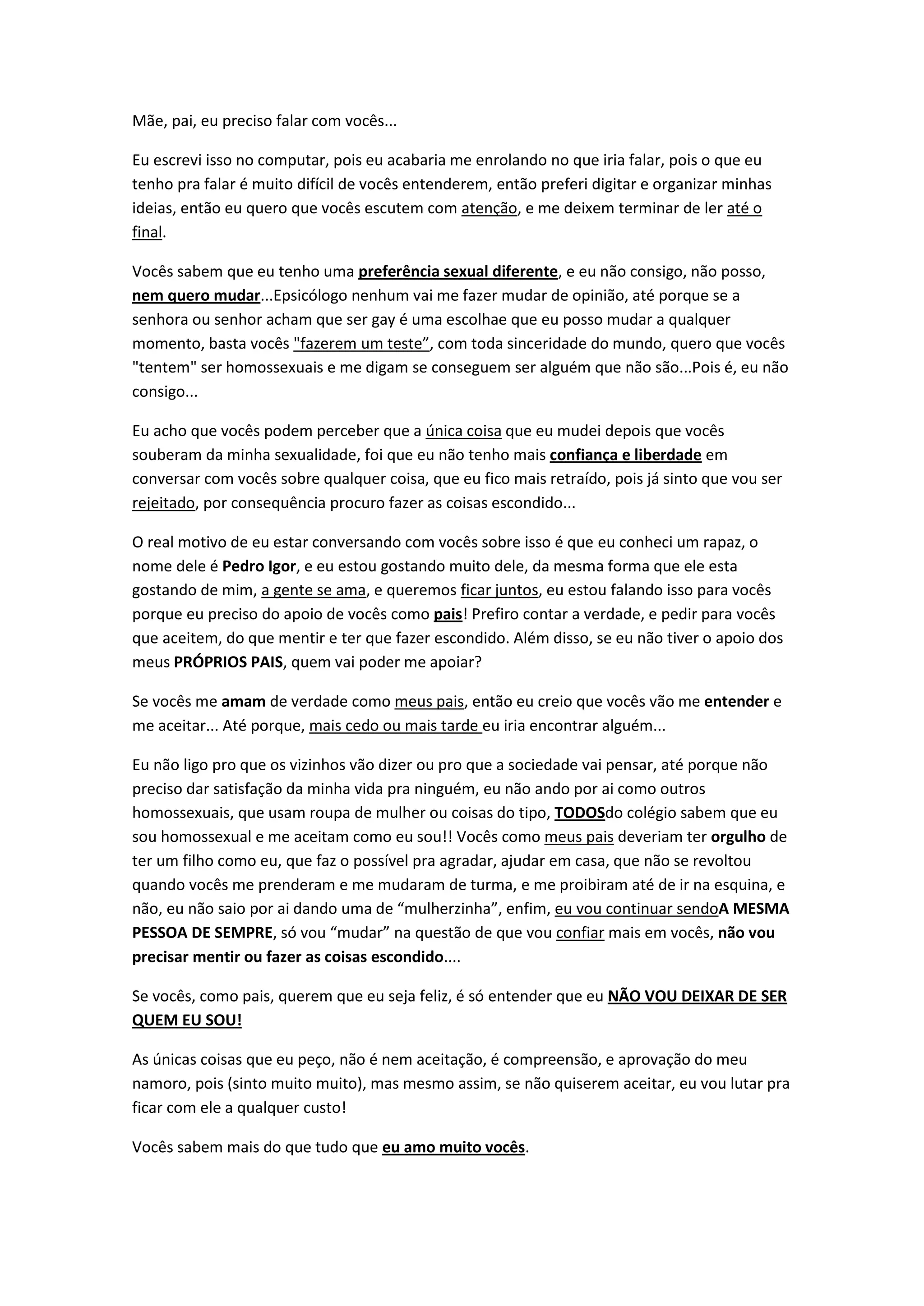 O filho escreve uma carta aos pais revelando que é gay e está apaixonado por outro rapaz. Ele pede compreensão e aceitação dos pais, e que o deixem namorar livremente. Ele diz que tentou mudar, mas não consegue e não quer ser alguém diferente do que é.