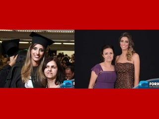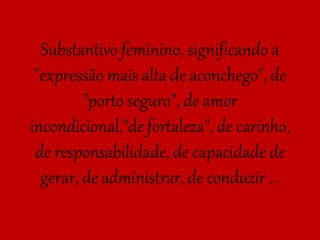 O documento descreve a mãe como a expressão máxima de aconchego, amor incondicional e fortaleza. A autora teve o privilégio de ter a melhor mãe do mundo, que sempre esteve presente em seus pensamentos e sonhos, ajudando-a a realizá-los. A mãe ensinou valores como amor, fé e responsabilidade.