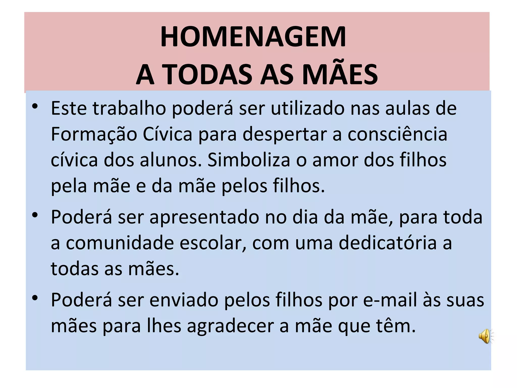 Este documento é uma homenagem às mães que destaca o amor incondicional das mães pelos seus filhos. Celebra momentos especiais entre mães e filhos como o colo maternal e o crescimento das crianças, e promete que o amor de uma mãe nunca será esquecido.